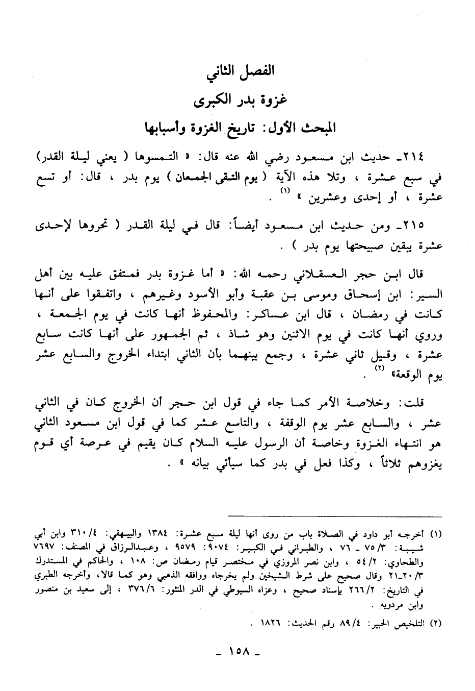 214 - حديث ابن مسعود رضي الله عنه قال: "التمسوها (يعني ليلة القدر) في سبع عشرة، وتلا هذه الآية (يوم التقى الجمعان) يوم بدر، قال: أو تسع عشرة، أو إحدى وعشرين" (¬1).