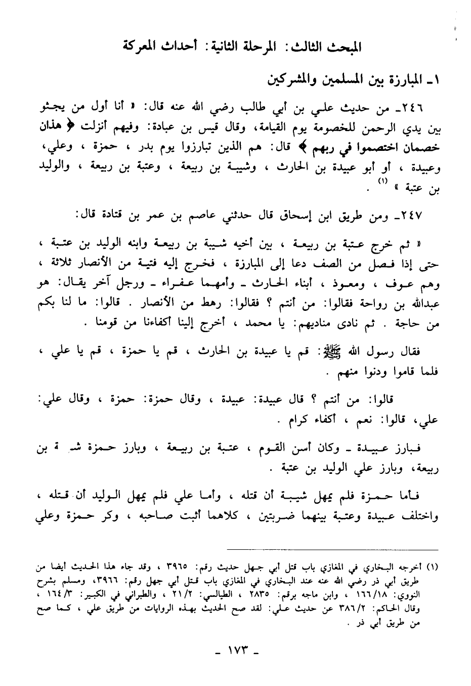 فبارز عبيدة -وكان أسن القوم، عتبة بن ربيعة، وبارز حمزة شيبة بن ربيعة، وبارز علي الوليد بن عتبة.