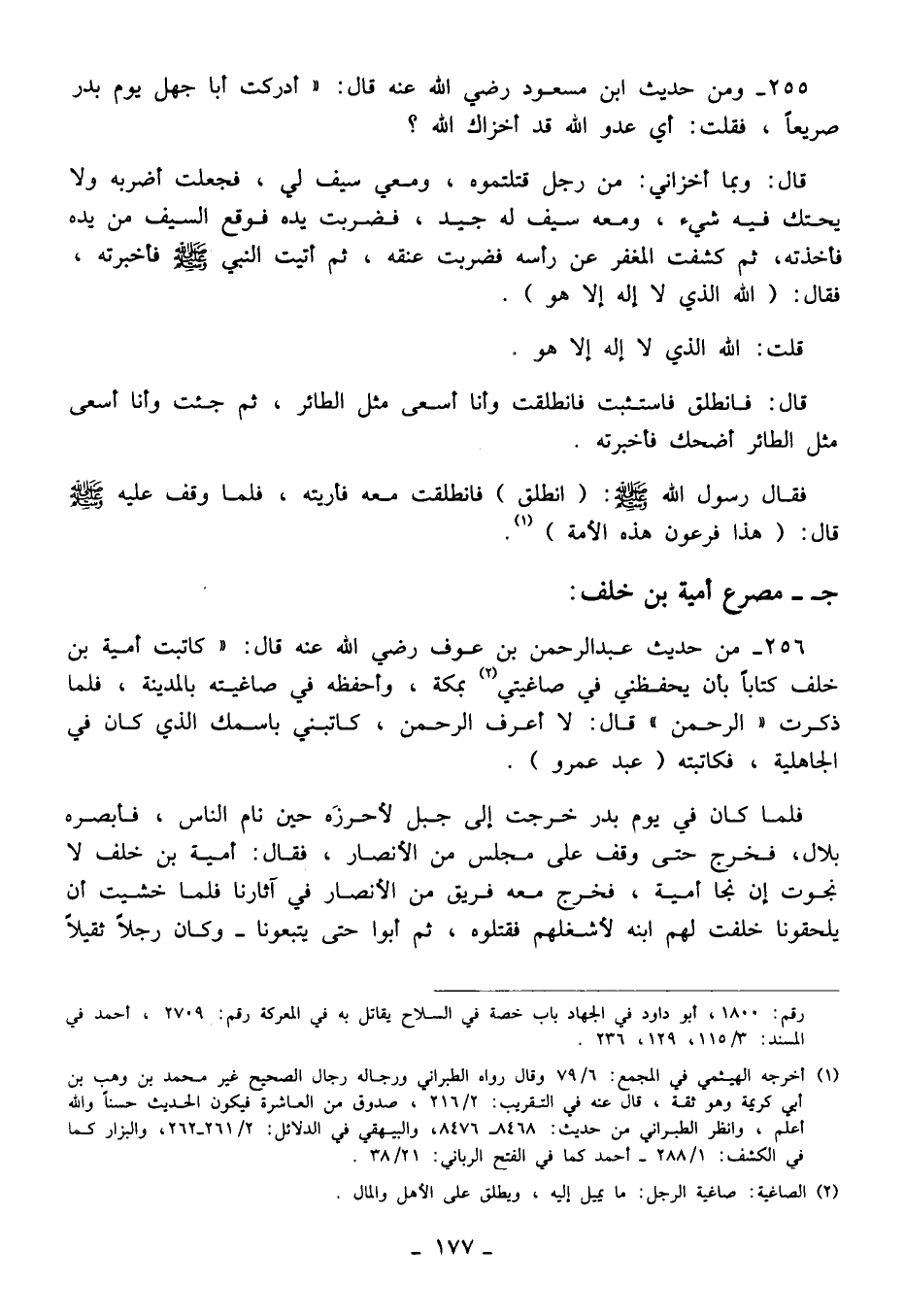 255 - ومن حديث ابن مسعود رضي الله عنه قال: "أدركت أبا جهل يوم بدر صريعًا، فقلت: أي عدو الله قد أخزاك الله؟ قال: وبما أخزاني: من رجل قتلتموه، ومعي سيف لي، فجعلت أضربه ولا يحتك فيه شيء، ومعه سيف له جيد، فضربت يده فوقع السيف من يده فأخذته، ثم كشفت المغفر عن رأسه فضربت عنقه، ثم أتيت النبي - صلى الله عليه وسلم - فأخبرته، فقال: (الله الذي لا إله إلا هو).