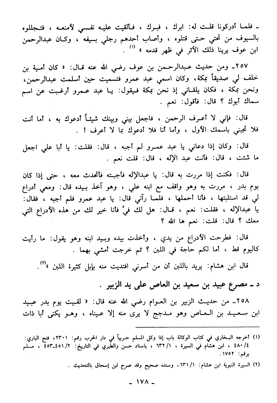 257 - ومن حديث عبد الرحمن بن عوف رضي الله عنه قال: "كان أمية بن خلف لي صديقًا بمكة، وكان اسمي عبد عمرو فتسميت حين أسلمت عبد الرحمن، ونحن بمكة، فكان يلقاني إذ نحن بمكة فيقول: يا عبد عمرو أرغبت عن اسم سماك أبوك؟ قال: فأقول: نعم.