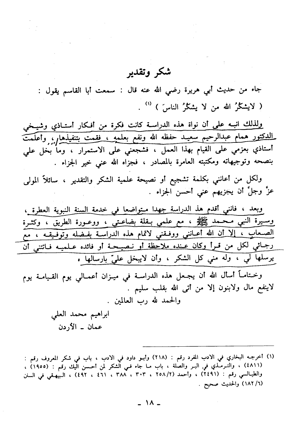 ولذلك أنبه على أن نواة هذه الدراسة كانت فكرة من أفكار أستاذي وشيخي الدكتور همام عبد الرحيم سعيد حفظه الله ونفع بعلمه، فقمت بتنفيذها، وأعلمت أستاذي بعزمي على القيام بهذا العمل، فشجعني على الاستمرار، وما بخل علي بنصحه وتوجيهاته ومكتبته العامرة بالمصادر، فجزاه الله عني خير الجزاء.
