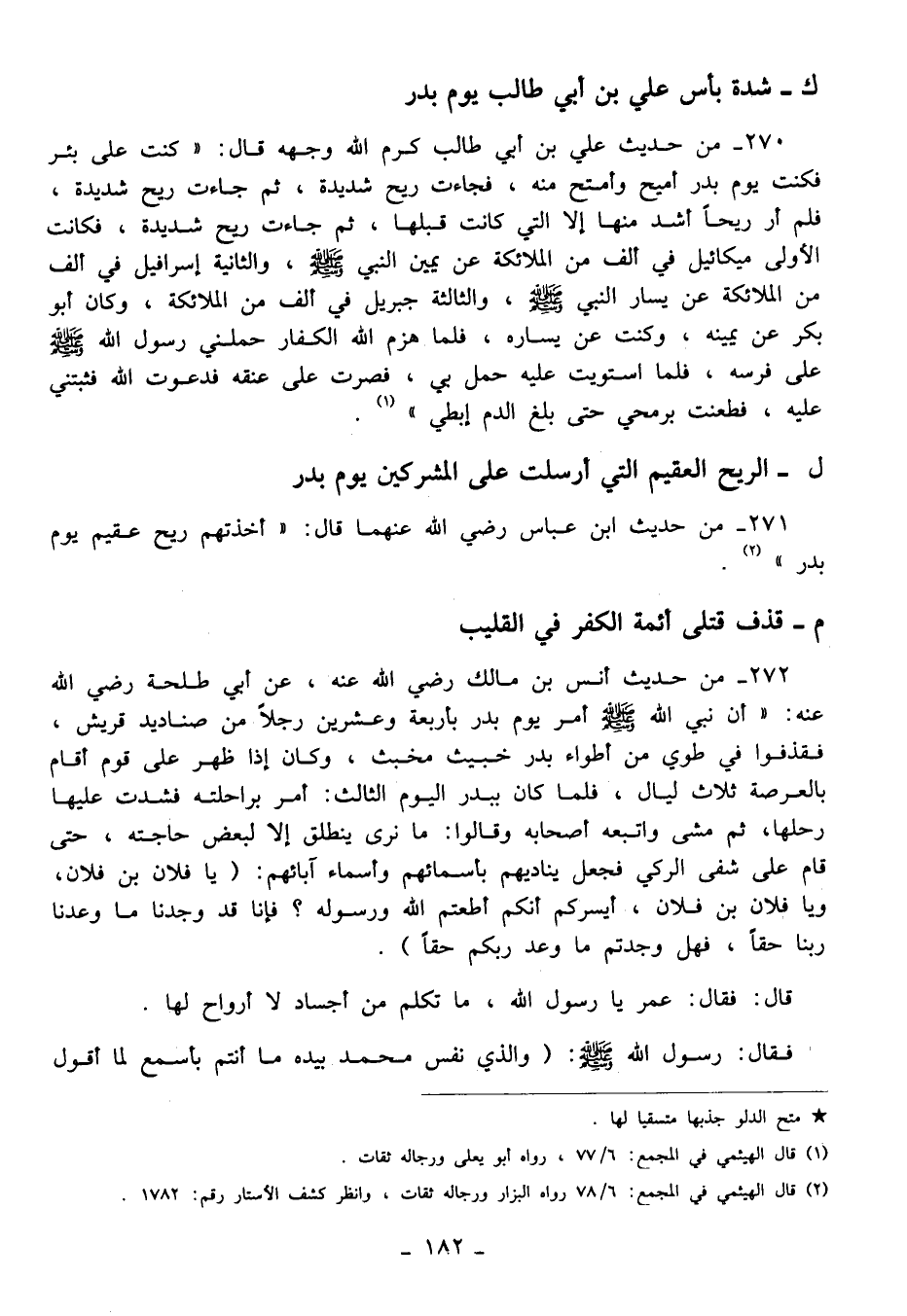 270 - من حديث علي بن أبي طالب كرم الله وجهه قال: "كنت على بئر فكنت يوم بدر أميح وأمتح منه، فجاءت ريح شديدة، ثم جاءت ريح شديدة، فلم أر ريحًا أشد منها إلا التي كانت قبلها، ثم جاءت ريح شديدة، فكانت الأولى ميكائيل في ألف من الملائكة عن يمين النبي - صلى الله عليه وسلم -، والثانية إسرافيل في ألف من الملائكة عن يسار النبي - صلى الله عليه وسلم -، والثالثة جبريل في ألف من الملائكة، وكان أبو بكر عن يمينه، وكنت عن يساره، فلما هزم الله الكفار حملني رسول الله - صلى الله عليه وسلم - على فرسه، فلما استويت عليه حمل لي، فصرت على عنقه فدعوت الله فثبتني عليه، فطعنت برمحي حتى بلغ الدم إبطي" (¬1).