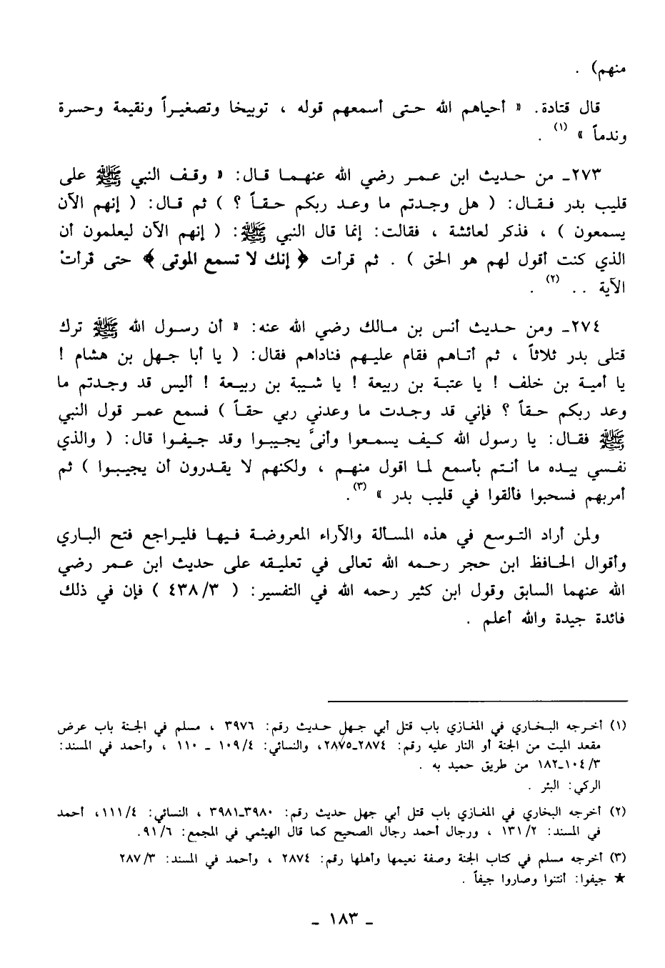 274 - ومن حديث أنس بن مالك رضي الله عنه: "أن رسول الله - صلى الله عليه وسلم - ترك قتلى بدر ثلاثًا، ثم أتاهم فقام عليهم فناداهم فقال: (يا أبا جهل بن هشام! يا أمية بن خلف! يا عتبة بن ربيعة! يا شيبة بن ربيعة! أليس قد وجدتم ما وعد ربكم حقًّا؟ فإني قد وجدت ما وعدني ربي حقًّا) فسمع عمر قول النبي - صلى الله عليه وسلم - فقال: يا رسول الله كيف يسمعوا وأنَّى يجيبوا وقد جيفوا قال: (والذي نفسي بيده ما أنتم بأسمع لما أقول منهم، ولكنهم لا يقدرون أن يجيبوا) ثم أمر بهم فسحبوا فألقوا في قليب بدرًا" (¬3).