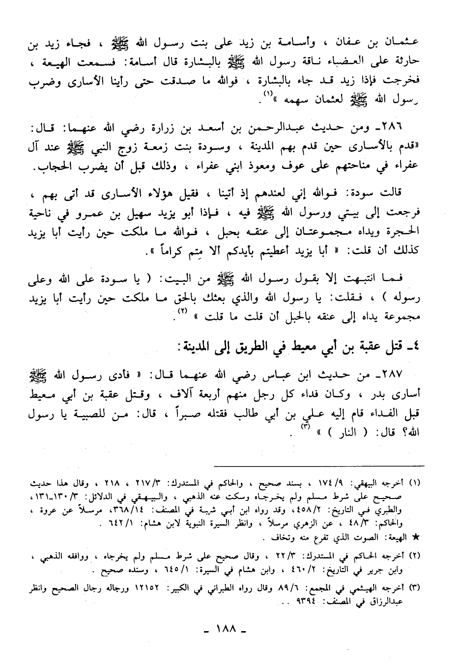 287 - من حديث ابن عباس رضي الله عنهما قال: "فأدى رسول الله - صلى الله عليه وسلم - أسارى بدر، وكان فداء كل رجل منهم أربعة آلاف، وقتل عقبة بن أبي معيط قبل الفداء قام إليه علي بن أبي طالب فقتله صبرًا، قال: من للصبية يا رسول الله؟ قال: (النار) (¬3).