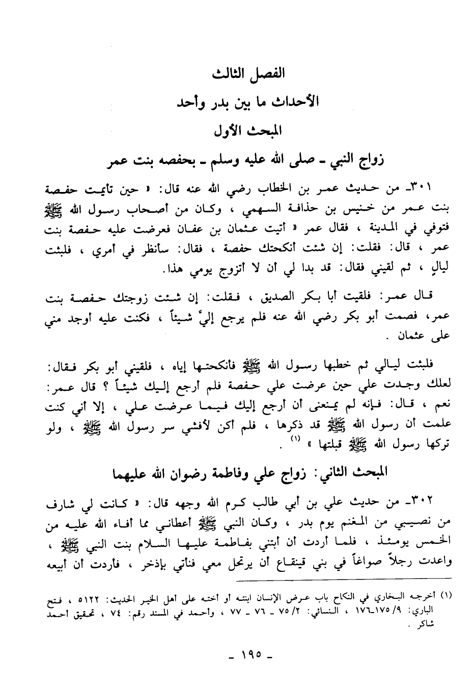 301 - من حديث عمر بن الخطاب رضي الله عنه قال: "حين تأيمت حفصة بنت عمر من خنيس بن حذافة السهمي، وكان من أصحاب رسول الله - صلى الله عليه وسلم - فتوفي في المدينة، فقال عمر "أتيت عثمان بن عفان فعرضت عليه حفصة بنت عمر، قال: فقلت: إن شئت أنكحتك حفصة، فقال: سأنظر في أمري، فلبثت ليالٍ، ثم لقيني فقال: قد بدا لي أن لا أتزوج يومي هذا.