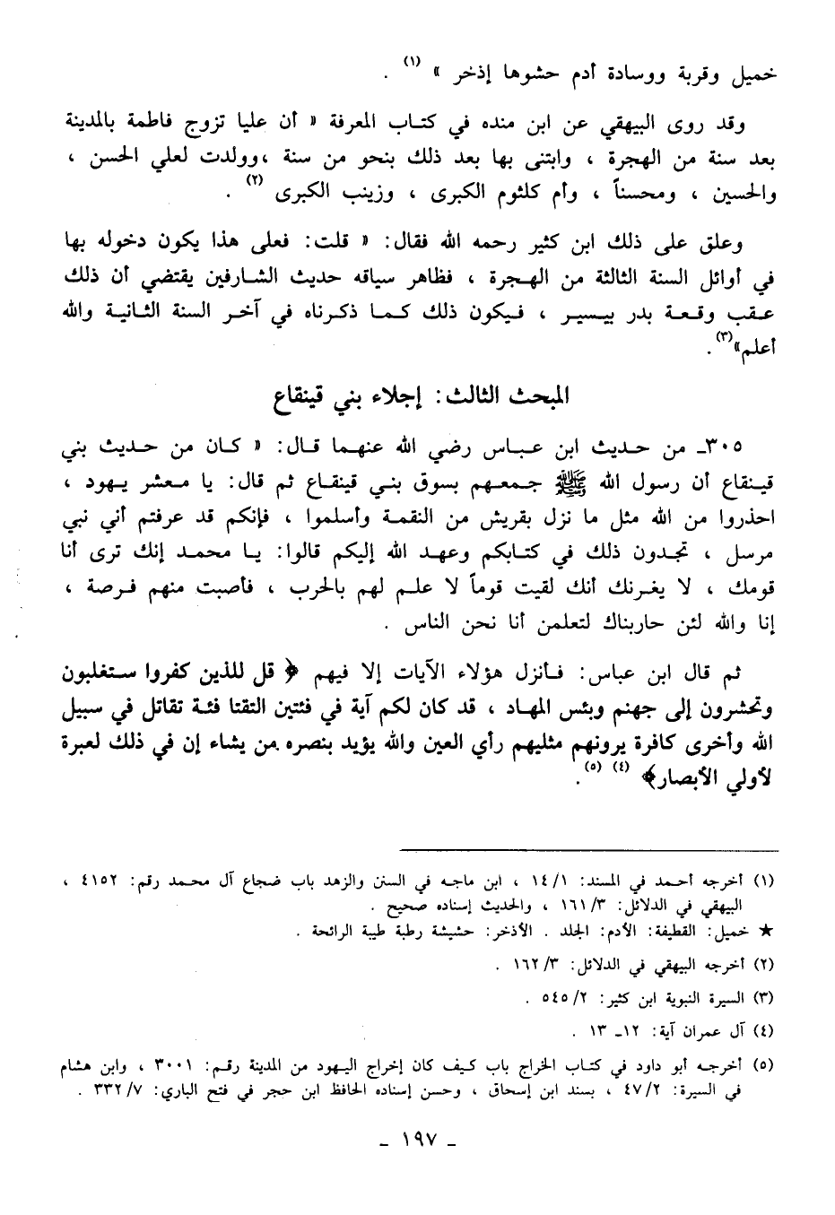 305 - من حديث ابن عباس رضي الله عنهما قال: "كان من حديث بني قينقاع أن رسول الله - صلى الله عليه وسلم - جمعهم بسوق بني قينقاع ثم قال: يا معشر يهود، احذروا من الله مثل ما نزل بقريش من النقمة وأسلموا، فإنكم قد عرفتم أني نبي مرسل، تجدون ذلك في كتابكم وعهد الله إليكم قالوا: يا محمد إنك ترى أنا قومك، لا يغرنك أنك لقيت قومًا لا علم لهم بالحرب، فأصبت منهم فرصة، إنا والله لئن حاربناك لتعلمن أنا نحن الناس.