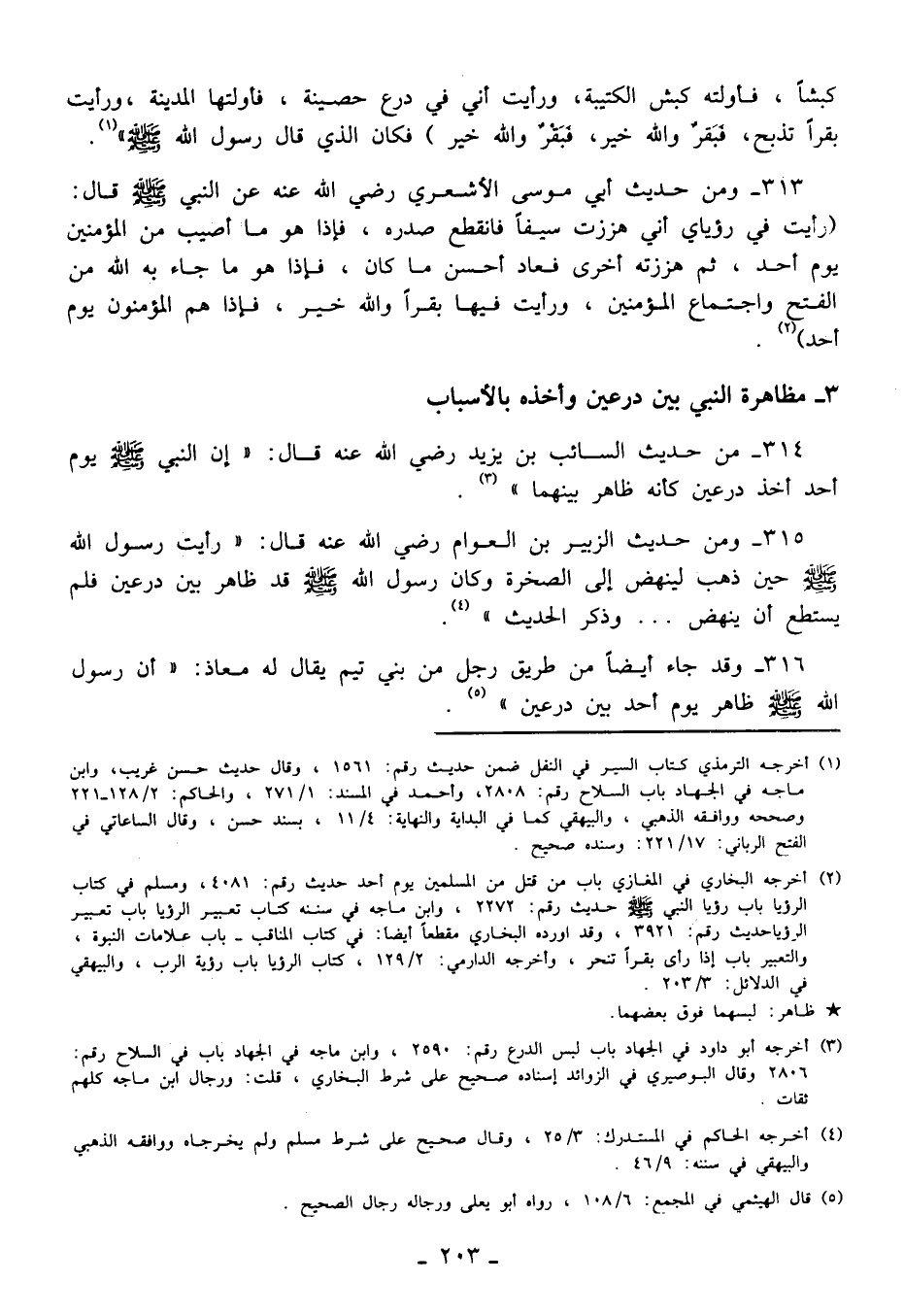314 - من حديث السائب بن يزيد رضي الله عنه قال: "إن النبي - صلى الله عليه وسلم - يوم أحد أخذ درعين كأنه ظاهر بينهما" (¬3).
