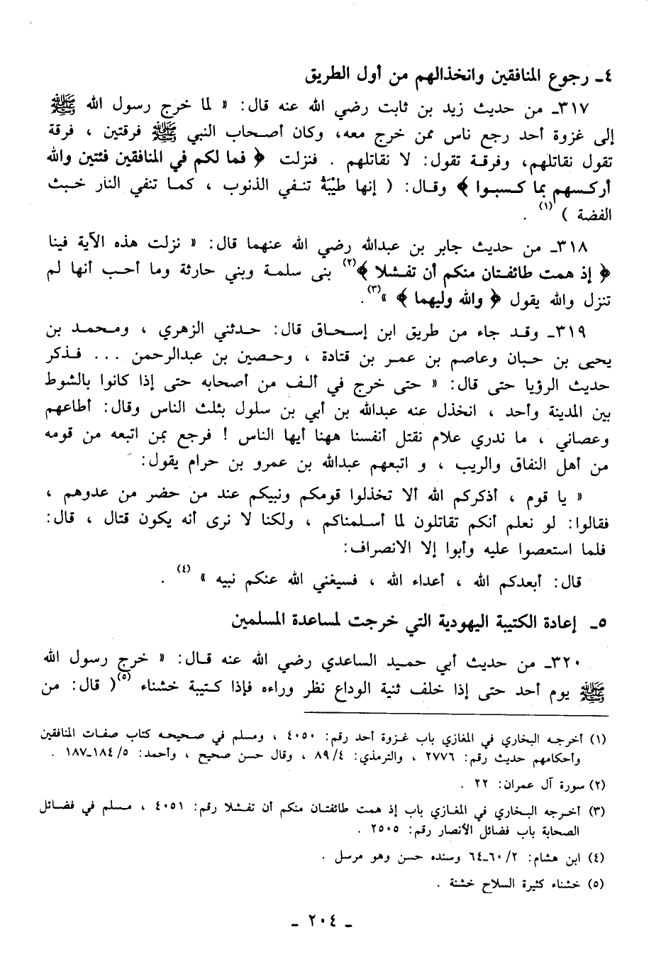 (¬1) أخرجه البخاري في المغازى باب غزوة أحد رقم: 4050، ومسلم في صحيحه كتاب صفات المنافقين وأحكامهم حديث رقم: 2776، والترمذي: 4/ 89، وقال حسن صحيح، وأحمد: 5/ 184 - 187.