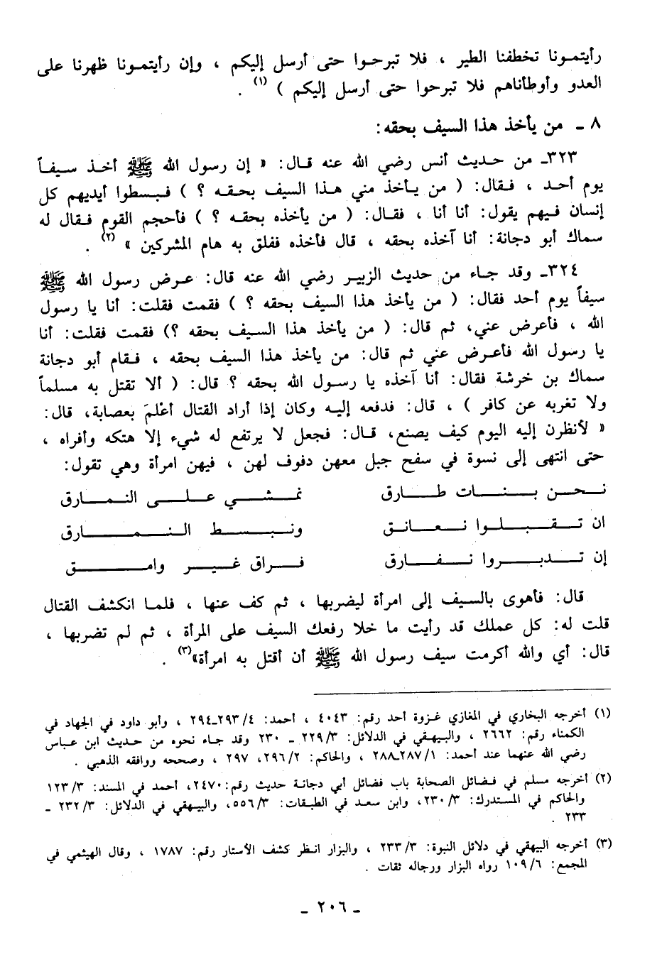 324 - وقد جاء من حديث الزبير رضي الله عنه قال: عرض رسول الله - صلى الله عليه وسلم - سيفًا يوم أحد فقال: (من يأخذ هذا السيف بحقه؟) فقمت فقلت: أنا يا رسول الله، فأعرض عني، ثم قال: (من يأخذ هذا السيف بحقه؟) فقمت فقلت: أنا يا رسول الله فأعرض عني ثم قال: من يأخذ هذا السيف بحقه، فقام أبو دجانة سماك بن خرشة فقال: أنا آخذه يا رسول الله بحقه؟ قال: (ألا تقتل به مسلمًا ولا تغربه عن كافر)، قال: فدفعه إليه وكان إذا أراد القتال أعلمَ بعصابة، قال: "لأنظرن إليه اليوم كيف يصنع، قال: فجعل لا يرتفع له شيء إلا هتكه وأفراه، حتى انتهى إلى نسوة في سفح جبل معهن دفوف لهن، فيهن امرأة وهي تقول: