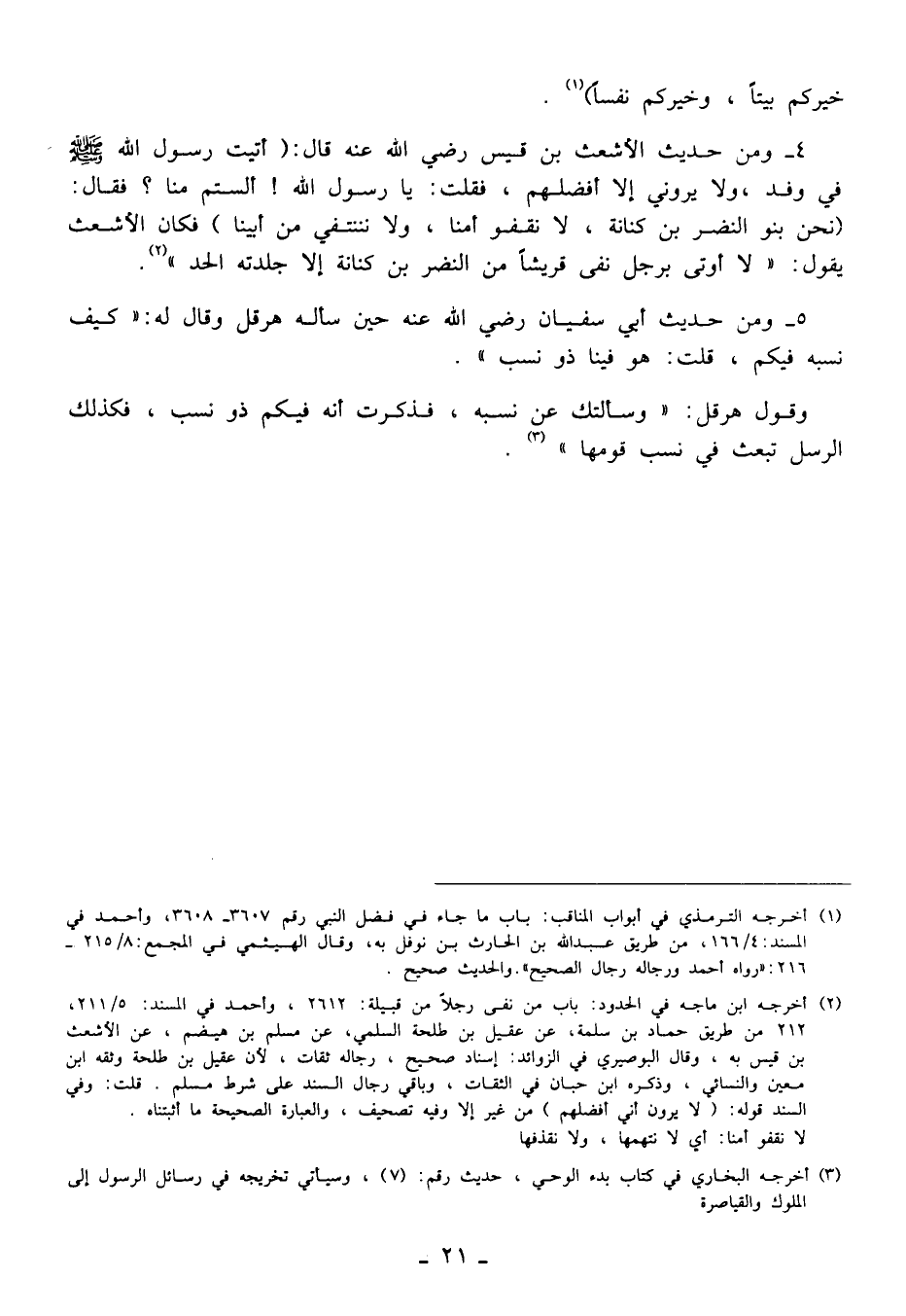 4 - ومن حديث الأشعث بن قيس رضي الله عنه قال: (أتيت رسول الله - صلى الله عليه وسلم - في وفد، ولا يروني إلا أفضلهم، فقلت: يا رسول الله! ألستم منا؟ فقال: (نحن بنو النضر بن كنانة، لا نقفو أمنا، ولا ننتفي من أبينا) فكان الأشعث يقول: "لا أوتى برجل نفى قريشًا من النضر بن كنانة إلا جلدته الحد" (¬2).
