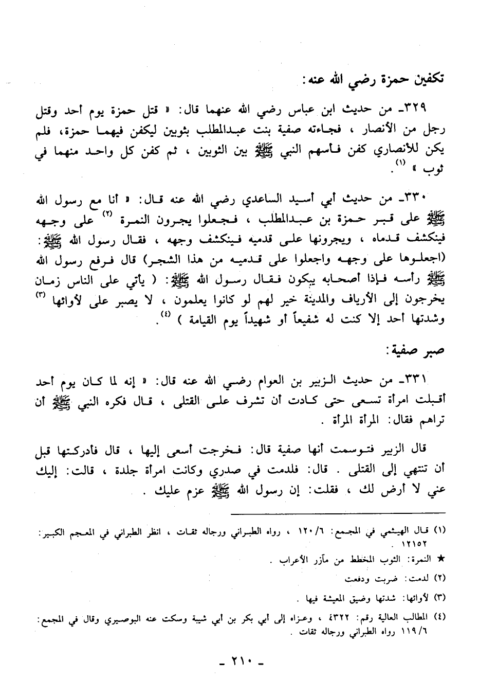331 - من حديث الزبير بن العوام رضي الله عنه قال: "إنه لما كان يوم أحد أقبلت امرأة تسعى حتى كادت أن تشرف على القتلى، قال فكره النبي - صلى الله عليه وسلم - أن تراهم فقال: المرأة المرأة.