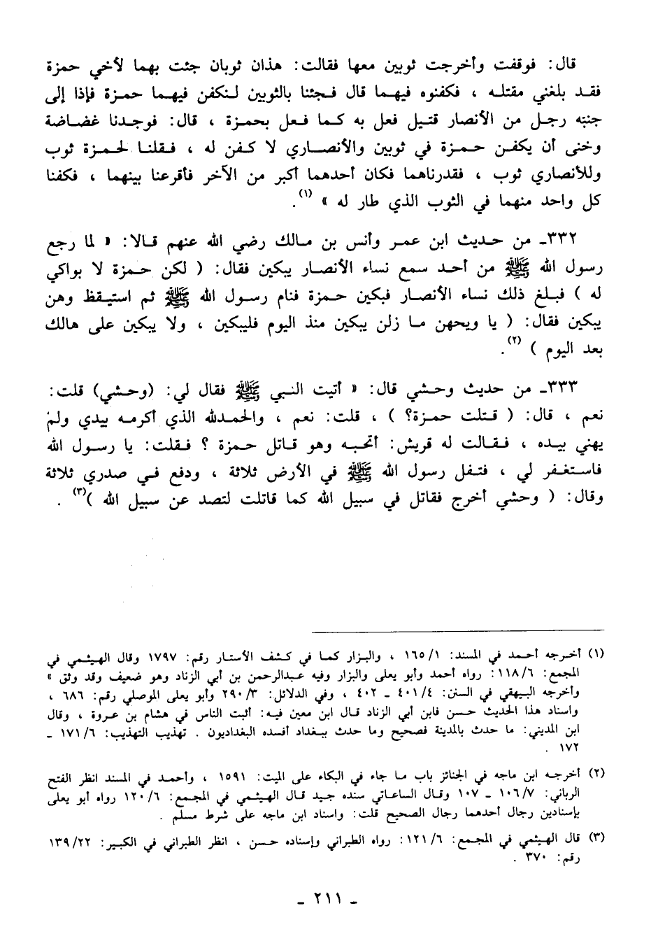 332 - من حديث ابن عمر وأنس بن مالك رضي الله عنهم قالا: "لما رجع رسول الله - صلى الله عليه وسلم - من أحد سمع نساء الأنصار يبكين فقال: (لكن حمزة لا بواكي له) فبلغ ذلك نساء الأنصار فبكين حمزة فنام رسول الله - صلى الله عليه وسلم - ثم استيقظ وهن يبكين فقال: (يا ويحهن ما زلن يبكين منذ اليوم فليبكين، ولا يبكين على هالك بعد اليوم) (¬2).