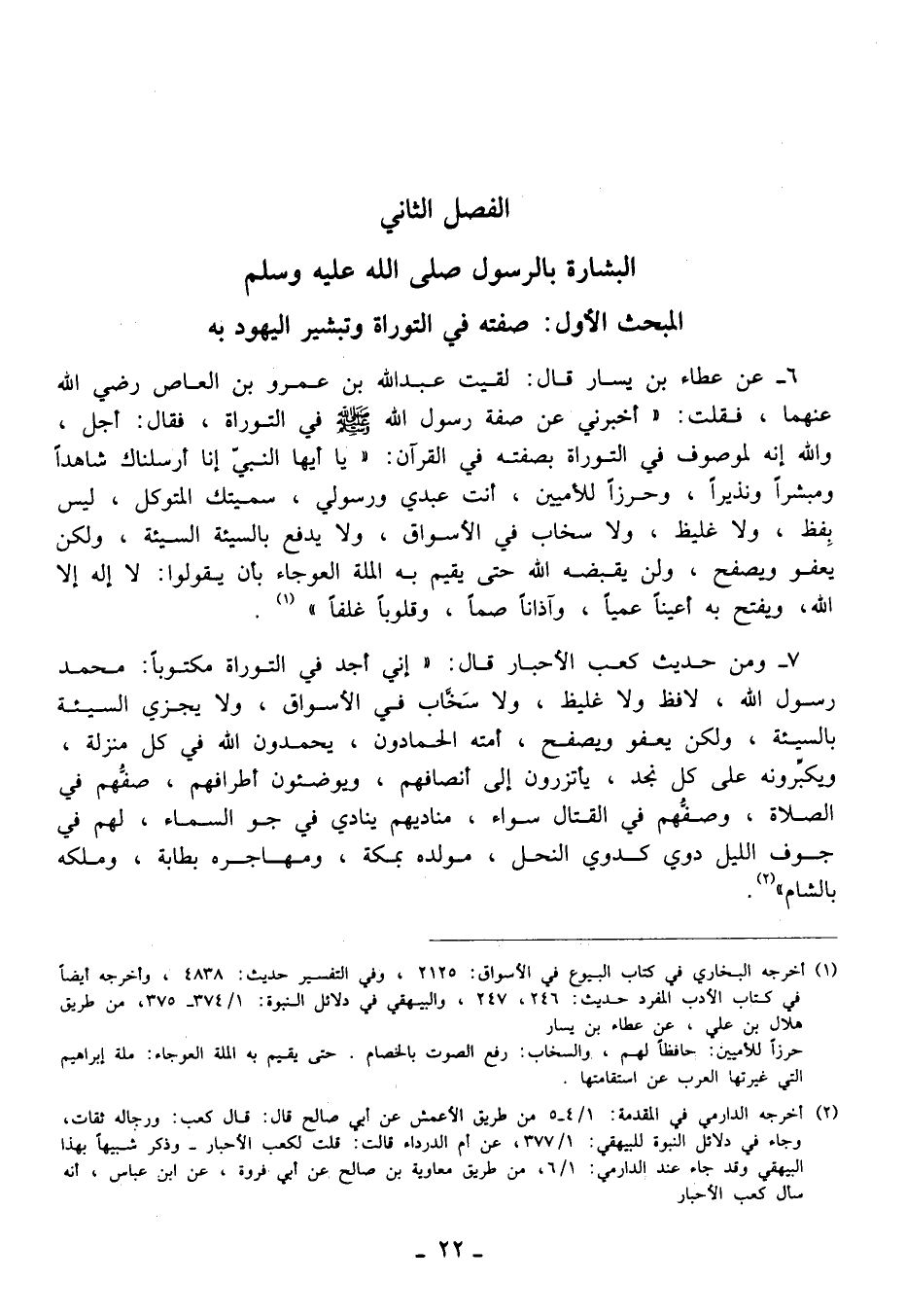 6 - عن عطاء بن يسار قال: لقيت عبد الله بن عمرو بن العاص رضي الله عنهما، فقلت: "أخبرني عن صفة رسول الله - صلى الله عليه وسلم - في التوراة، فقال: أجل، والله إنه لموصوف في التوراة بصفته في القرآن: "يا أيها النبيّ إنا أرسلناك شاهدًا ومبشرًا ونذيرًا، وحرزًا للأميين، أنت عبدي ورسولي، سميتك المتوكل، ليس بِفظ، ولا غليظ، ولا سخاب في الأسواق، ولا يدفع بالسيئة السيئة، ولكن يعفو ويصفح، ولن يقبضه الله حتى يقيم به الملة العوجاء بأن يقولوا: لا إله إلا الله، ويفتح به أعينًا عميًا، وآذانًا صمًّا، وقلوبًا غلفًا" (¬1).