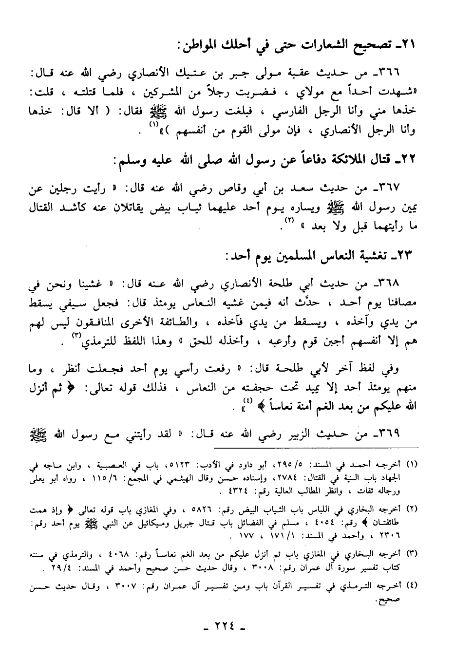 367 - من حديث سعد بن أبي وقاص رضي الله عنه قال: "رأيت رجلين عن يمين رسول الله - صلى الله عليه وسلم - ويساره يوم أحد عليهما ثياب بيض يقاتلان عنه كأشد القتال ما رأيتهما قبل ولا بعد" (¬2).