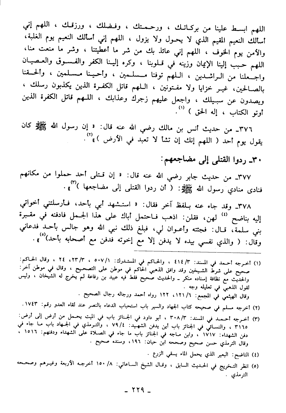 377 - من حديث جابر رضي الله عنه قال: "إن قتلى أحد حملوا من مكانهم فنادى منادي رسول الله - صلى الله عليه وسلم -: (أن ردوا القتلى إلى مضاجعها) (¬3) ".
