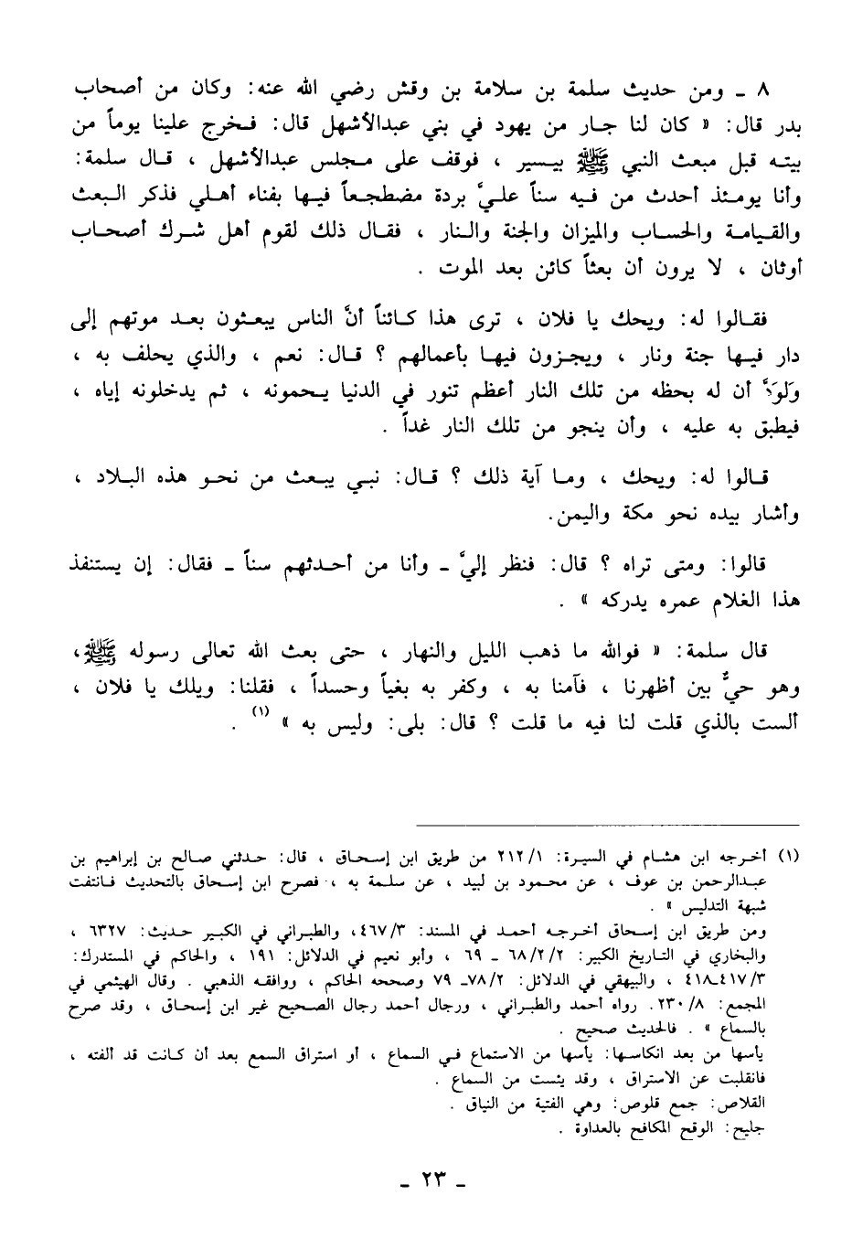 8 - ومن حديث سلمة بن سلامة بن وقش رضي الله عنه: وكان من أصحاب بدر قال: "كان لنا جار من يهود في بني عبد الأشهل قال: فخرج علينا يومًا من بيته قبل مبعث النبي - صلى الله عليه وسلم - بيسير، فوقف على مجلس عبد الأشهل، قال سلمة: وأنا يومئذ أحدث من فيه سنًّا عليَّ بردة مضطجعًا فيها بفناء أهلي فذكر البعث والقيامة والحساب والميزان والجنة والنار، فقال ذلك لقوم أهل شرك أصحاب أوثان، لا يرون أن بعثًا كائن بعد الموت.