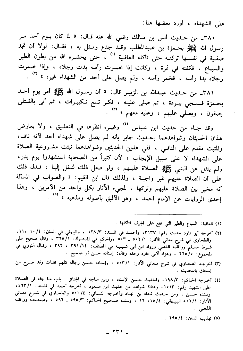 (¬4) أخرجه الحاكم: 3/ 198، والحديث حسن الإسناد، وابن ماجه في الجنائز. باب ما جاء في الصلاة على الشهيد رقم: 1513، وهناك شواهد من حديث ابن مسعود، أخرجه أحمد في المسند: 1/ 463، وسنده حسن، ومن حديث شداد بن الهاد وأخرجه النسائي: 4/ 506 والطحاوي في شرح معاني الآثار: 1/ 506 البيهقي: 4/ 15، 16، وسنده صحيح الحاكم: 3/ 595 - 596، وصححه ووافقه الذهبي.