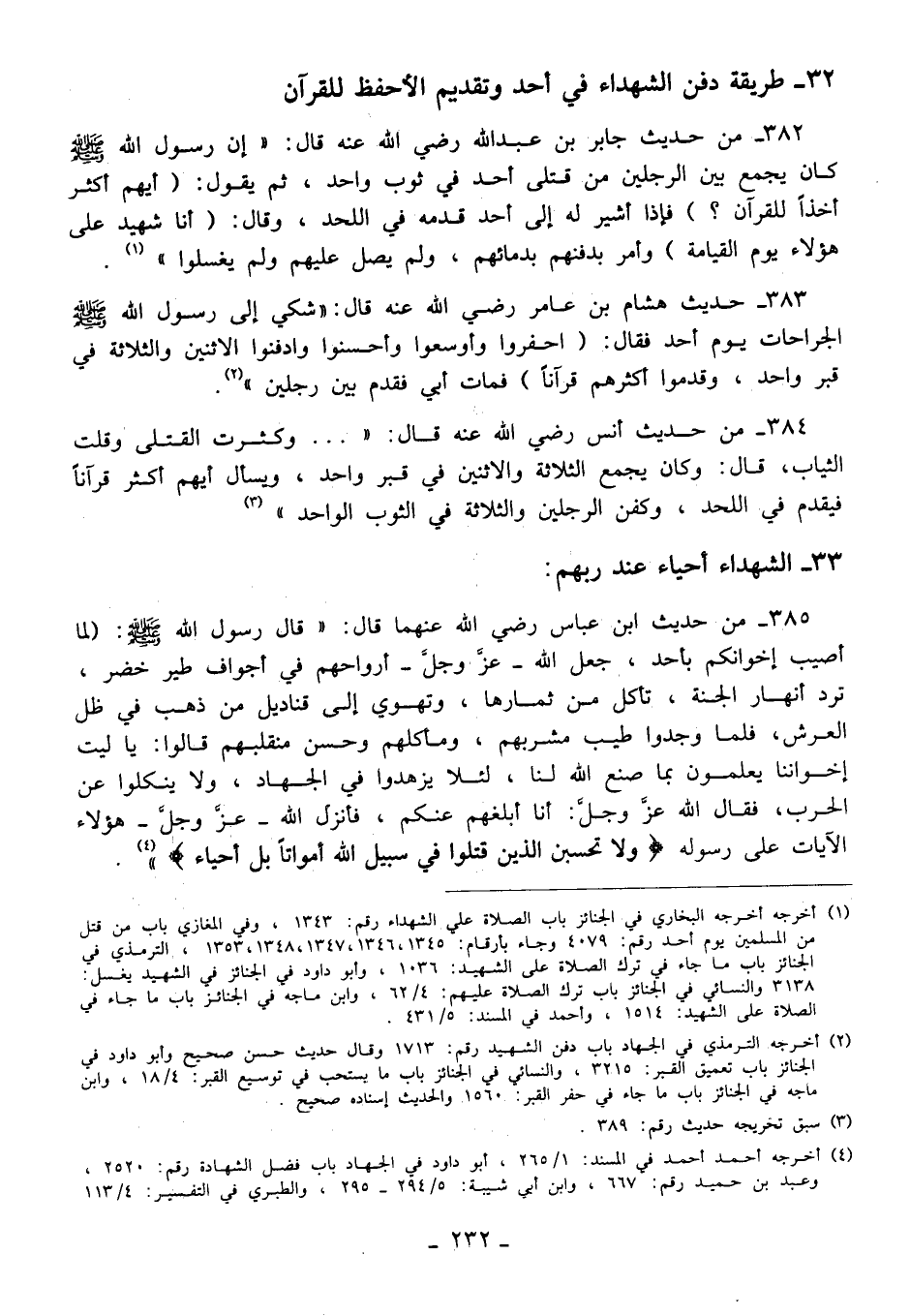 382 - من حديث جابر بن عبد الله رضي الله عنه قال: (إن رسول الله - صلى الله عليه وسلم - كان يجمع بين الرجلين من قتلى أحد في ثوب واحد، ثم يقول: (أيهم أكثر أخذًا للقرآن؟) فإذا أشير له إلى أحد قدمه في اللحد، وقال: (أنا شهيد على هؤلاء يوم القيامة) وأمر بدفنهم بدمائهم، ولم يصل عليهم ولم يغسلوا" (¬1).