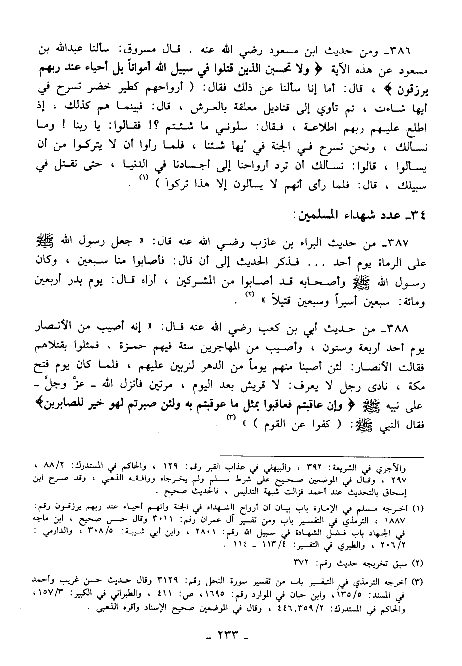 386 - ومن حديث ابن مسعود رضي الله عنه. قال مسروق: سألنا عبد الله بن مسعود عن هذه الآية {وَلَا تَحْسَبَنَّ الَّذِينَ قُتِلُوا فِي سَبِيلِ اللَّهِ أَمْوَاتًا بَلْ أَحْيَاءٌ عِنْدَ رَبِّهِمْ يُرْزَقُونَ}، قال: أما إنا سألنا عن ذلك فقال: (أرواحهم كطير خضر تسرح في أيها شاءت، ثم تأوي إلى قناديل معلقة بالعرش، قال: فبينما هم كذلك، إذ اطلع عليهم ربهم اطلاعة، فقال: سلوني ما شئتم؟! فقالوا: يا ربنا! وما نسألك، ونحن نسرح في الجنة في أيها شئنا، فلما رأوا أن لا يتركوا من أن يسألوا، قالوا: نسألك أن ترد أرواحنا إلى أجسادنا في الدنيا، حتى نقتل في سبيلك، قال: فلما رأى أنهم لا يسألون إلا هذا تركوا) (¬1).