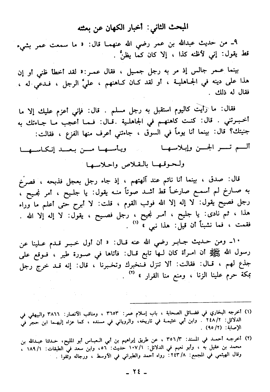 قال: صدق، بينما أنا نائم عند آلهتهم، إذ جاء رجل بعجل فذبحه، فصرخ به صارخ لم أسمع صارخًا قط أشد صوتًا منه يقول: يا جليح، أمر نجيح، رجل فصيح يقول: لا إله إلا الله فوثب القوم، قلت: لا أبرح حتى أعلم ما وراء هذا، ثم نادى: يا جليح، أمر نجيح، رجل فصيح، يقول: لا إله إلا الله.