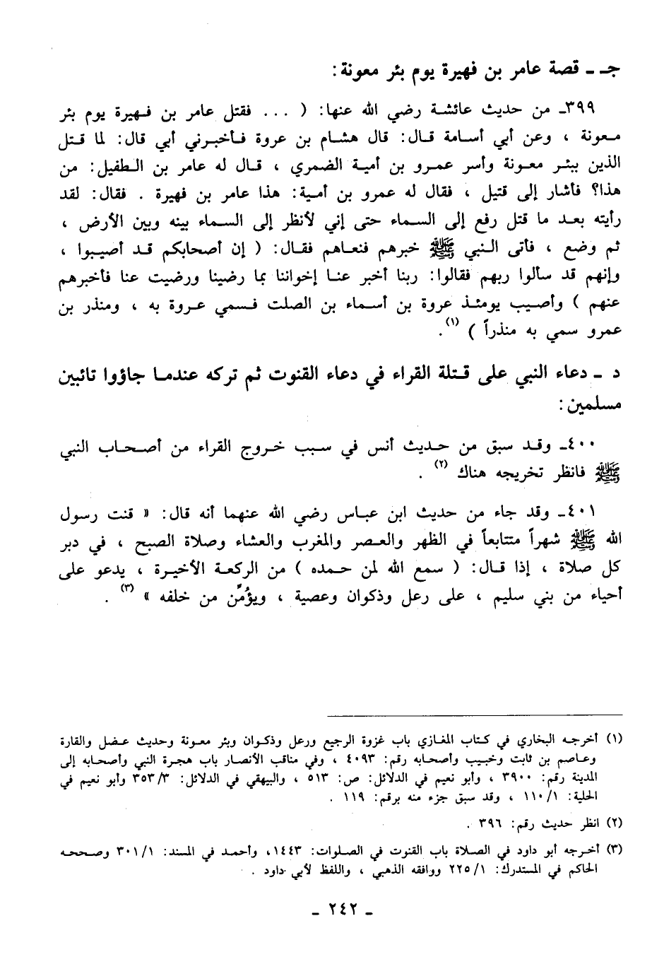 399 - من حديث عائشة رضي الله عنها: (... فقتل عامر بن فهيرة يوم بئر معونة، وعن أبي أسامة قال: قال هشام بن عروة فأخبرني أبي قال: لما قتل الذين ببئر معونة وأسر عمرو بن أمية الضمري، قال له عامر بن الطفيل: من هذا؟ فأشار إلى قتيل، فقال له عمرو بن أمية: هذا عامر بن فهيرة. فقال: لقد رأيته بعد ما قتل رفع إلى السماء حتى إني لأنظر إلى السماء بينه وبين الأرض، ثم وضع، فأتى النبي - صلى الله عليه وسلم - خبرهم فنعاهم فقال: (إن أصحابكم قد أصيبوا، وإنهم قد سألوا ربهم فقالوا: ربنا أخبر عنا إخواننا بما رضينا ورضيت عنا فأخبرهم عنهم) وأصيب يومئذ عروة بن أسماء بن الصلت فسمي عروة به، ومنذر بن عمرو سمي به منذرًا) (¬1).