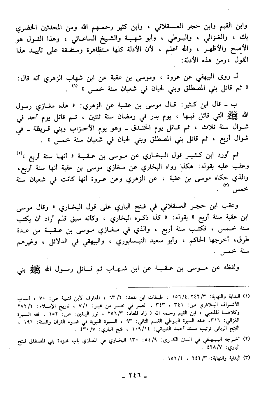 ثم أورد ابن كثير قول البخاري عن موسى بن عقبة "أنها سنة أربع" (¬2) وعقب عليه بقوله: هكذا رواه البخاري عن مغازي موسى بن عقبة أنها سنة أربع، والذي حكاه موسى بن عقبة، عن الزهري وعن عروة أنها كانت في شعبان سنة خمس (¬3).