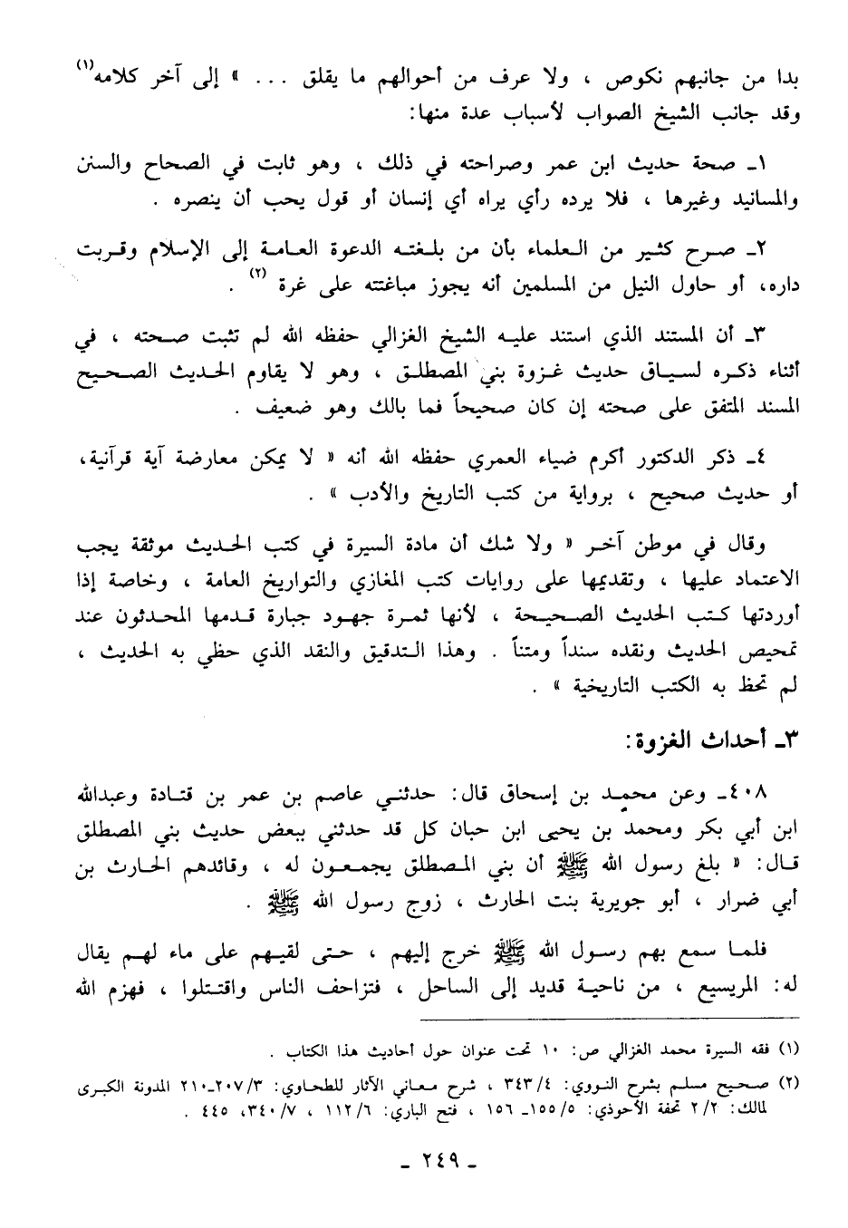 3 - أن المستند الذي استند عليه الشيخ الغزالي حفظه الله لم تثبت صحته، في أثناء ذكره لسياق حديث غزوة بني المصطلق، وهو لا يقاوم الحديث الصحيح المسند المتفق على صحته إن كان صحيحًا فما بالك وهو ضعيف.