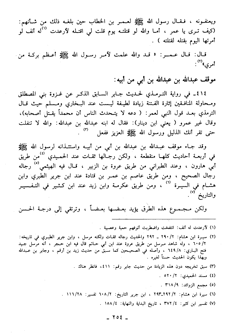 وقد جاء موقف عبد الله بن عبد الله بن أبي من أبيه واستئذانه لرسول الله - صلى الله عليه وسلم - في أربعة أحاديث كلها منقطعة، ولكن رجالها ثقات عند الحميدي (¬4) من طريق أبي هارون، وعند الطبراني من طريق عروة بن الزبير، قال فيه الهيثمي (¬5) رجاله رجال الصحيح، ومن طريق عاصم بن عمر بن قتادة عند ابن جرير الطبري وابن هشام في السيرة (¬6)، ومن طريق عكرمة وابن زيد عند ابن كثير في التفسير والتاريخ (¬7).