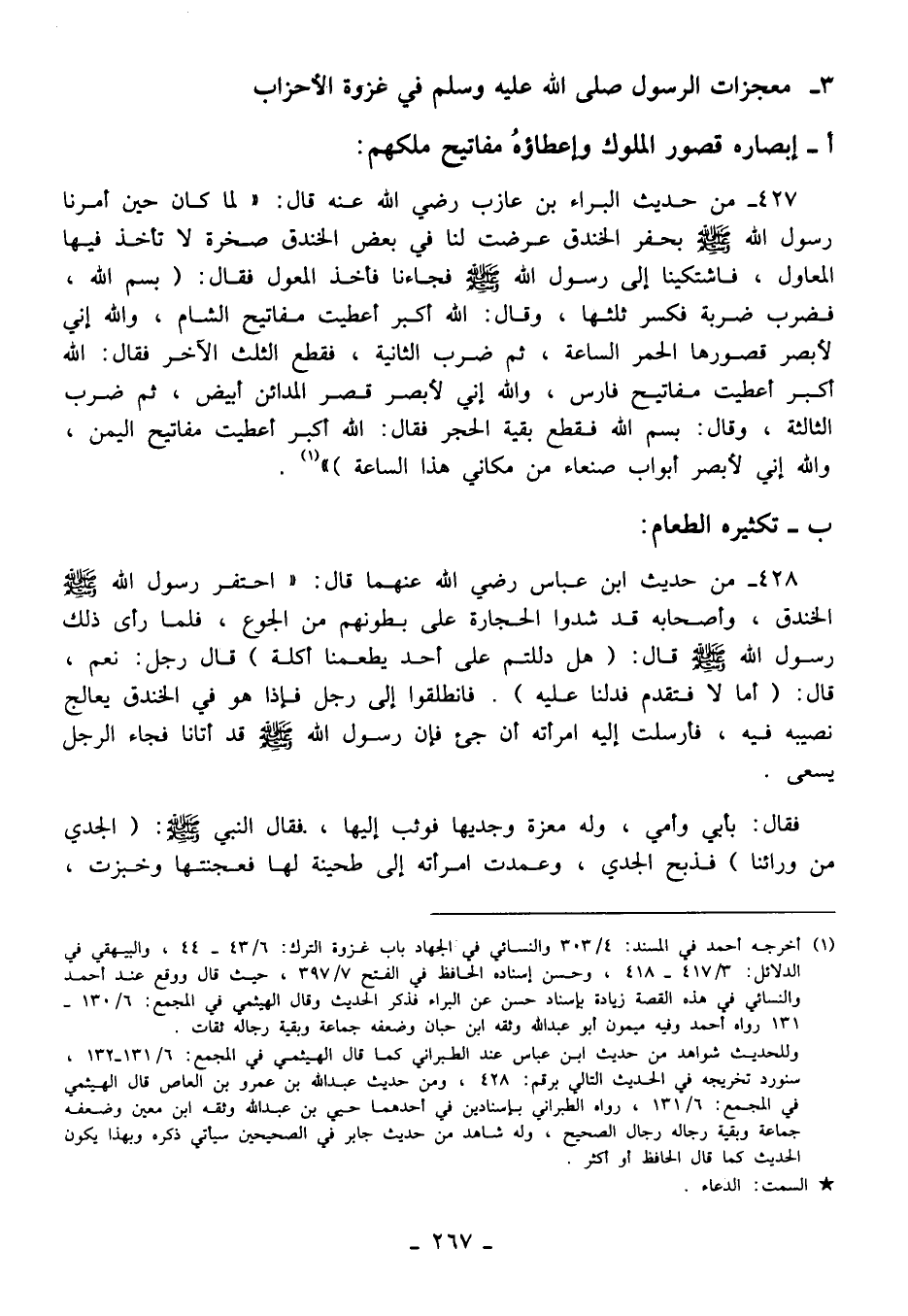 427 - من حديث البراء بن عازب رضي الله عنه قال: "لما كان حين أمرنا رسول الله - صلى الله عليه وسلم - بحفر الخندق عرضت لنا في بعض الخندق صخرة لا تأخذ فيها المعاول، فاشتكينا إلى رسول الله - صلى الله عليه وسلم - فجاءنا فأخذ المعول فقال: (بسم الله، فضرب ضربة فكسر ثلثها، وقال: الله أكبر أعطيت مفاتيح الشام، والله إني لأبصر قصورها الحمر الساعة، ثم ضرب الثانية، فقطع الثلث الآخر فقال: الله أكبر أعطيت مفاتيح فارس، والله إني لأبصر قصر المدائن أبيض، ثم ضرب الثالثة، وقال: بسم الله فقطع بقية الحجر فقال: الله أكبر أعطيت مفاتيح اليمن، والله إني لأبصر أبواب صنعاء من مكاني هذا الساعة) " (¬1).