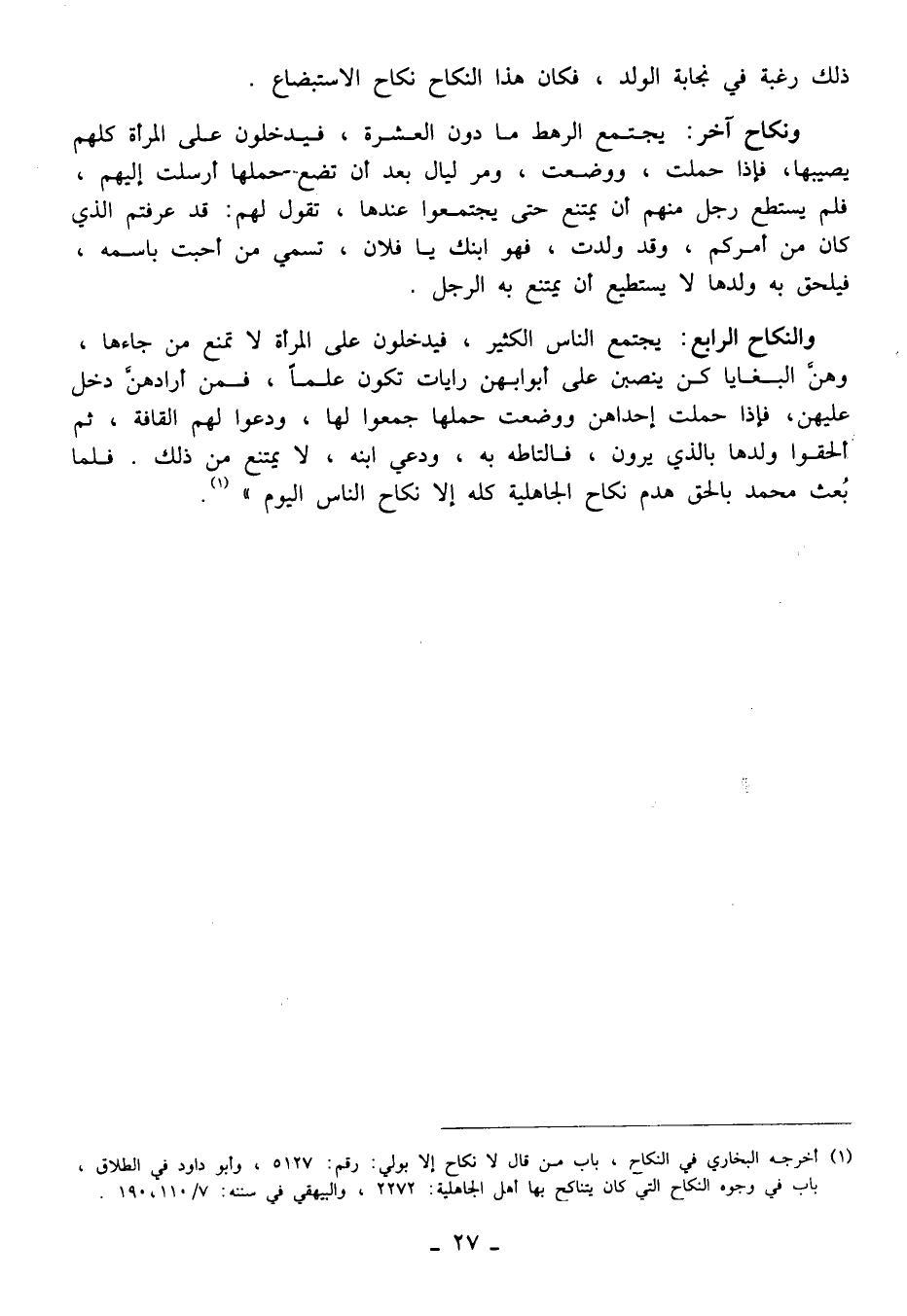 (¬1) أخرجه البخاري في النكاح، باب من قال لا نكاح إلا بولي: رقم: 5127، وأبو داود في الطلاق، باب في وجوه النكاح التي كان يتناكح بها أهل الجاهلية: 2272، والبيهقي في سننه: 7/ 110، 190.