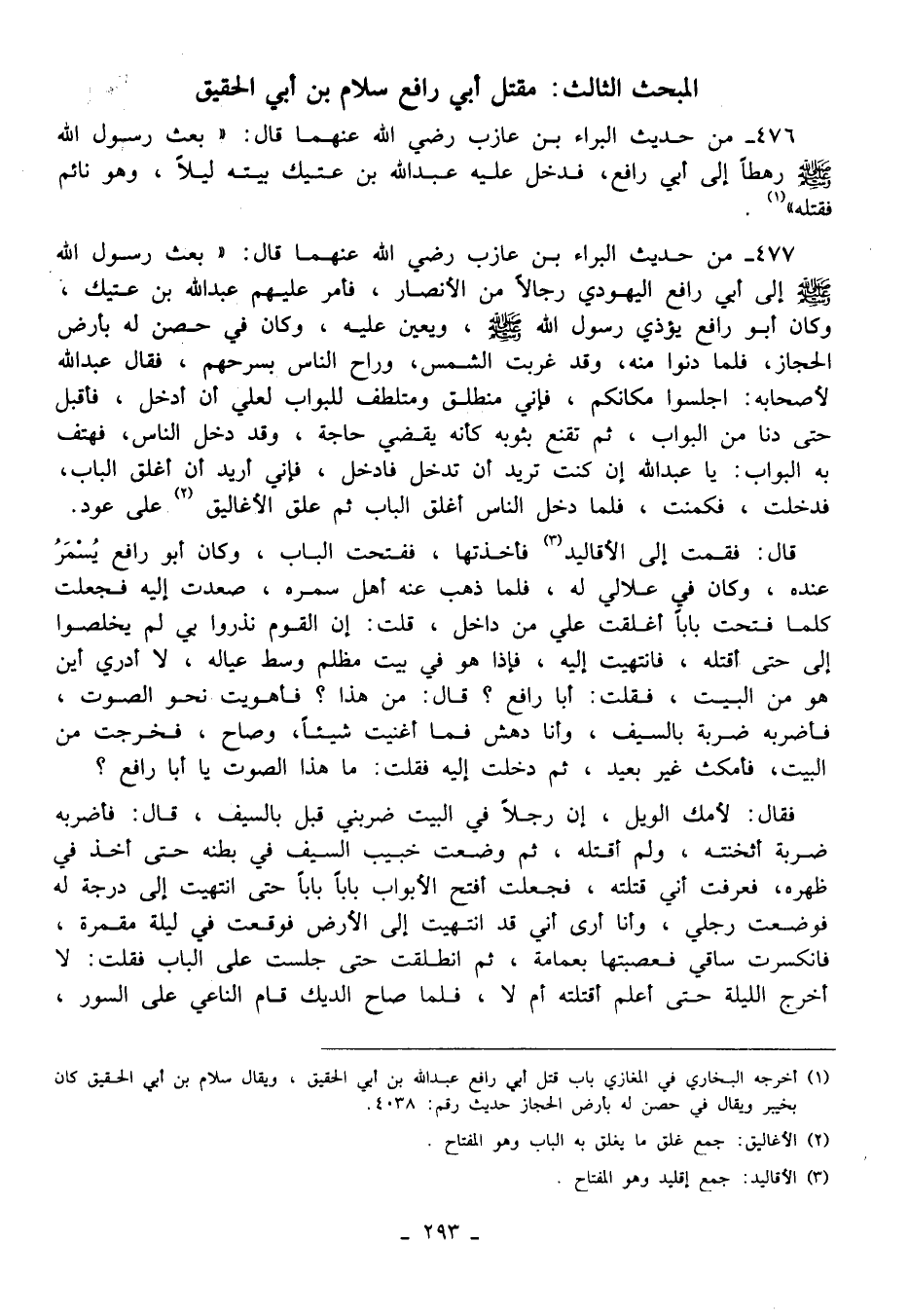 476 - من حديث البراء بن عازب رضي الله عنهما قال: "بعث رسول الله - صلى الله عليه وسلم - رهطًا إلى أبي رافع، فدخل عليه عبد الله بن عتيك بيته ليلًا، وهو نائم فقتله" (¬1).