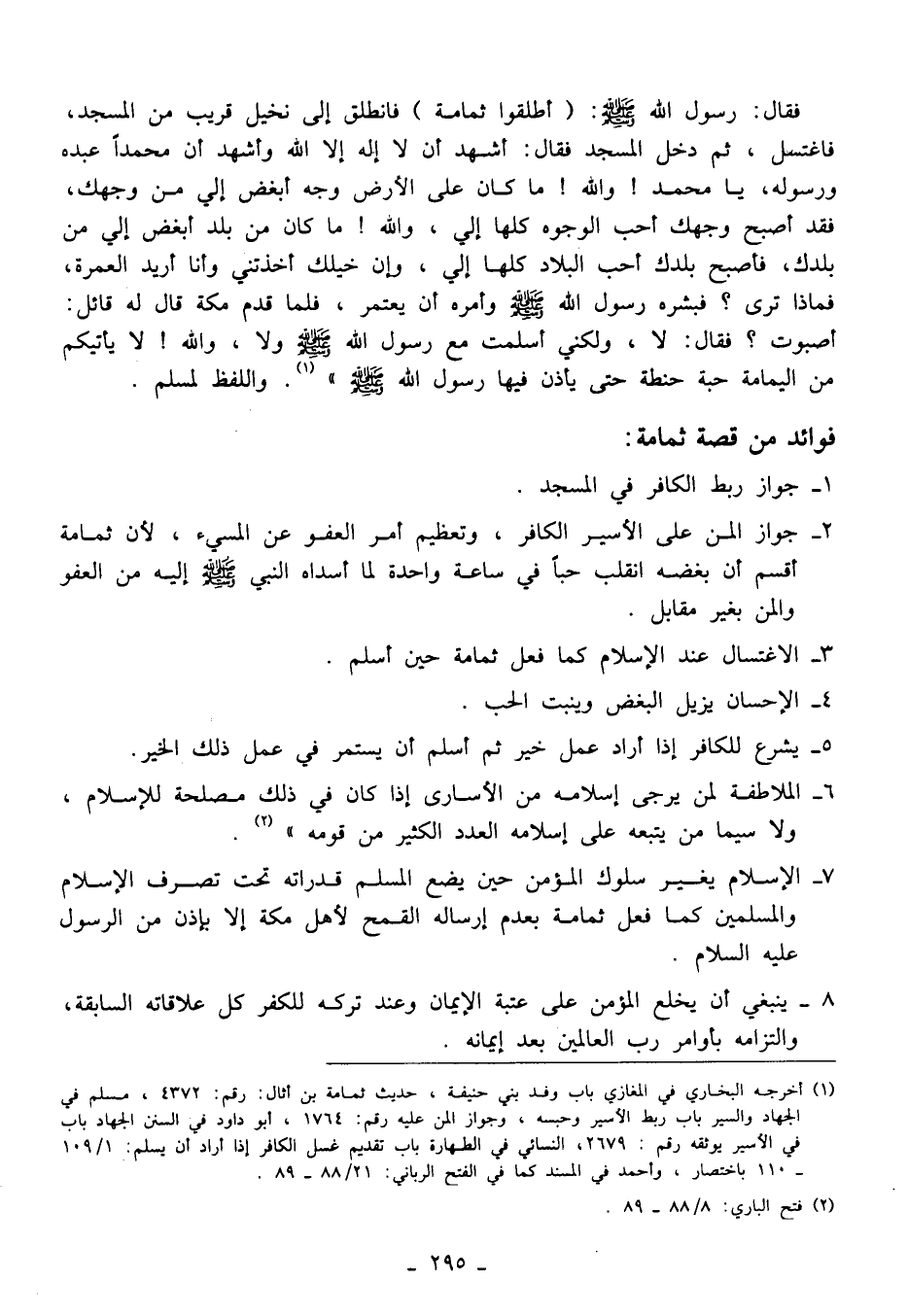 (¬1) أخرجه البخاري في المغازي باب وفد بني حنيفة، حديث ثمامة بن أثال: رقم: 4372، مسلم في الجهاد والسير باب ربط الأسير وحبسه، وجواز المن عليه رقم: 1764، أبو داود في السنن الجهاد باب في الأسير يوثقه رقم: 2679، النسائي في الطهارة باب تقديم غسل الكافر إذا أراد أن يسلم: 1/ 109 - 110 باختصار، وأحمد في المسند كما في الفتح الرباني: 21/ 88 - 89.