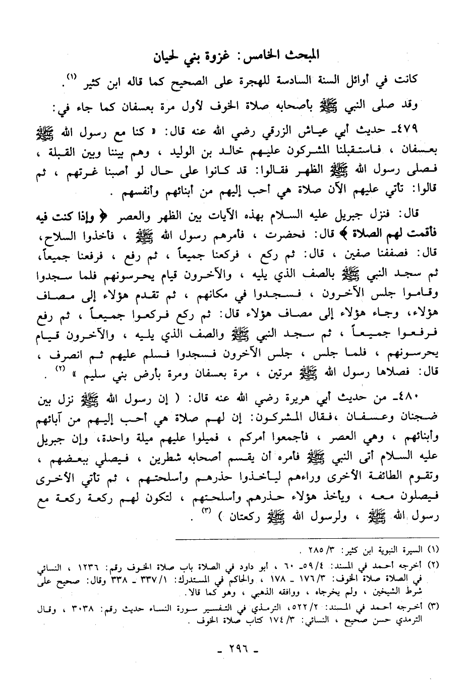 479 - حديث أبي عياش الزرقي رضي الله عنه قال: "كنا مع رسول الله - صلى الله عليه وسلم - بعسفان، فاستقبلنا المشركون عليهم خالد بن الوليد، وهم بيننا وبين القبلة، فصلى رسول الله - صلى الله عليه وسلم - الظهر فقالوا: قد كانوا على حال لو أصبنا غرتهم، ثم قالوا: تأتي عليهم الآن صلاة هي أحب إليهم من أبنائهم وأنفسهم.
