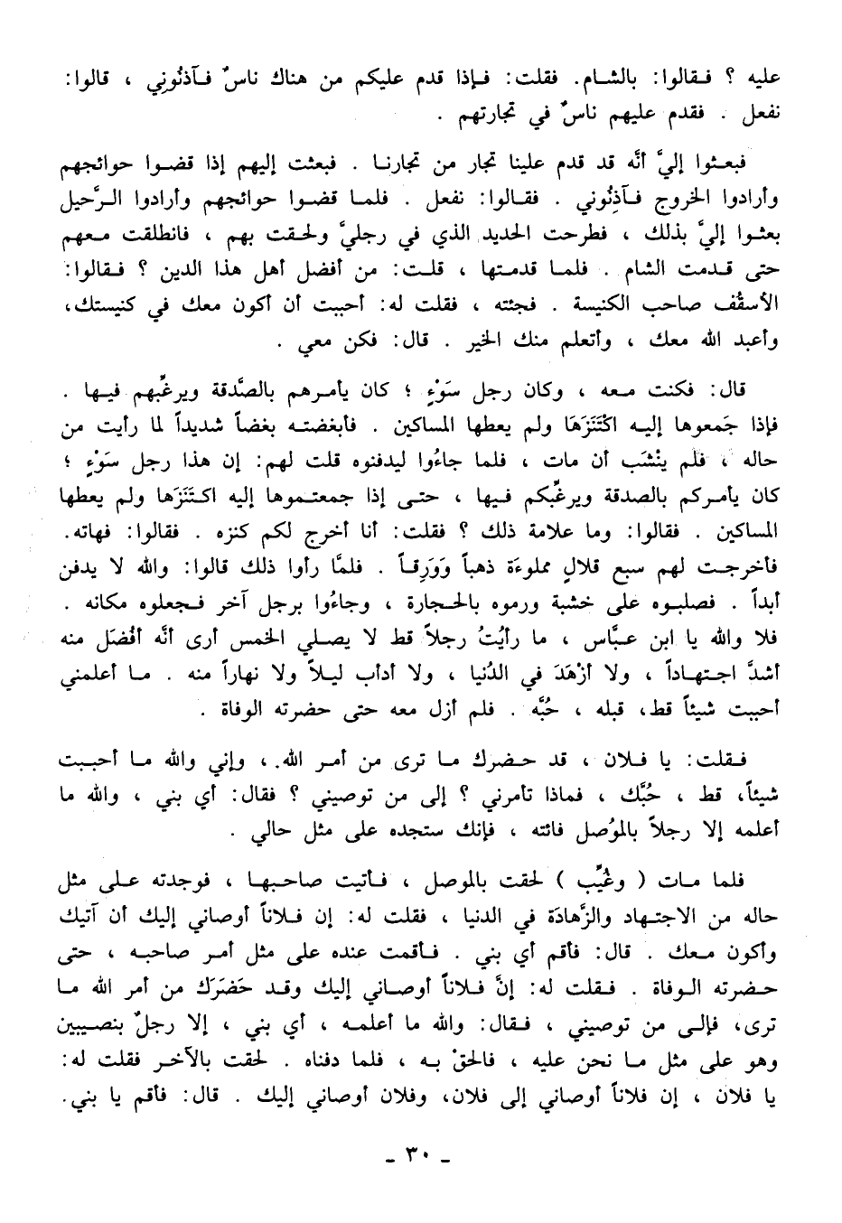 فلما مات (وغُيِّب) لحقت بالموصل، فأتيت صاحبها، فوجدته على مثل حاله من الاجتهاد والزَّهادَة في الدنيا، فقلت له: إن فلانًا أوصاني إليك أن آتيك وأكون معك. قال: فأقم أي بني. فأقمت عنده على مثل أمر صاحبه، حتى حضرته الوفاة. فقلت له: إنَّ فلانًا أوصاني إليك وقد حَضَرَك من أمر الله ما ترى، فإلى من توصيني، فقال: والله ما أعلمه، أي بني، إلا رجلٌ بنصيبين وهو على مثل ما نحن عليه، فالحقْ به، فلما دفناه. لحقت بالآخر فقلت له: يا فلان، إن فلانًا أوصاني إلى فلان، وفلان أوصاني إليك. قال: فأقم يا بني.