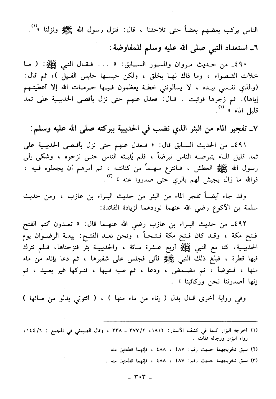 491 - من الحديث السابق قال: "فعدل عنهم حتى نزل بأقصى الحديبية على ثمد قليل الماء يتبرضه الناس تبرضًا، فلم يُلبثه الناس حتى نزحوه، وشكى إلى رسول الله - صلى الله عليه وسلم - العطش، فانتزع سهمًا من كنانته، ثم أمرهم أن يجعلوه فيه، فوالله ما زال يجيش لهم بالري حتى صدروا عنه" (¬3).