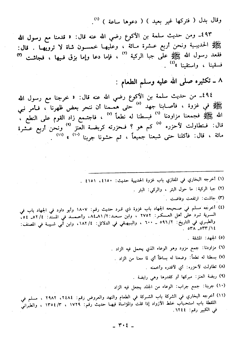 494 - من حديث سلمة بن الأكوع رضي الله عنه قال: "خرجنا مع رسول الله - صلى الله عليه وسلم - في غزوة، فأصابنا جهد (¬5) حتى هممنا أن ننحر بعض ظهرنا، فأمر نبي الله - صلى الله عليه وسلم - فجمعنا مزاودنا (¬6) فبسطنا له نطعًا (¬7)، فاجتمع زاد القوم على النطع، قال: فتطاولت لأحزره (¬8) كم هو؟ فحزرته كربضة العنز (¬9) ونحن أربع عشرة مائة، قال: فأكلنا حتى شبعنا جميعًا، ثم حشونا جربنا (¬10) " (¬11).