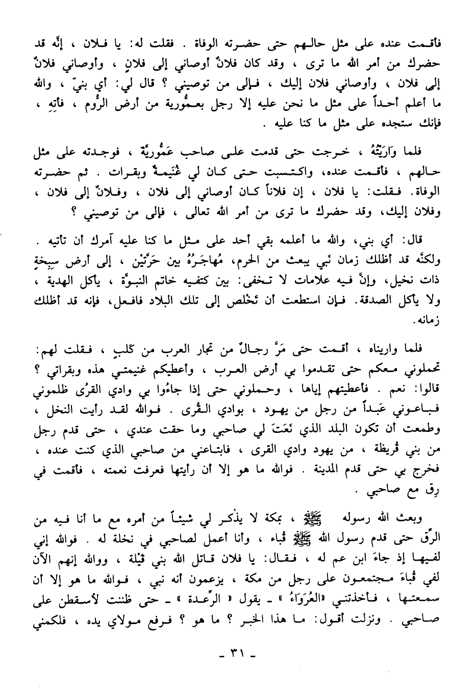 ولكنَّه قد أظلك زمان نَبي يبعث من الحرم، مُهاجَرُهُ بين حَرَّتيْن، إلى أرض سِبِخةٍ ذات نخيل، وإنَّ فيه علامات لا تخفى: بين كتفيه خاتم النبوَّة، يأكل الهدية، ولا يأكل الصدقة. فإن استطعت أن تَخْلص إلى تلك البلاد فافعل، فإنه قد أظلك زمانه.