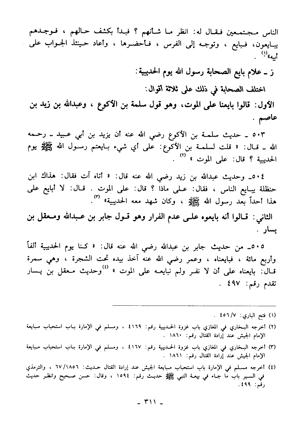 (¬4) أخرجه مسلم في الإمارة باب استحباب مبايعة الجيش عند إرادة القتال حديث: 1856/ 67، والترمذي في السير باب ما جاء في بيعة النبي - صلى الله عليه وسلم - حديث رقم: 1594، وقال حسن صحيح وانظر حديث رقم: 499.