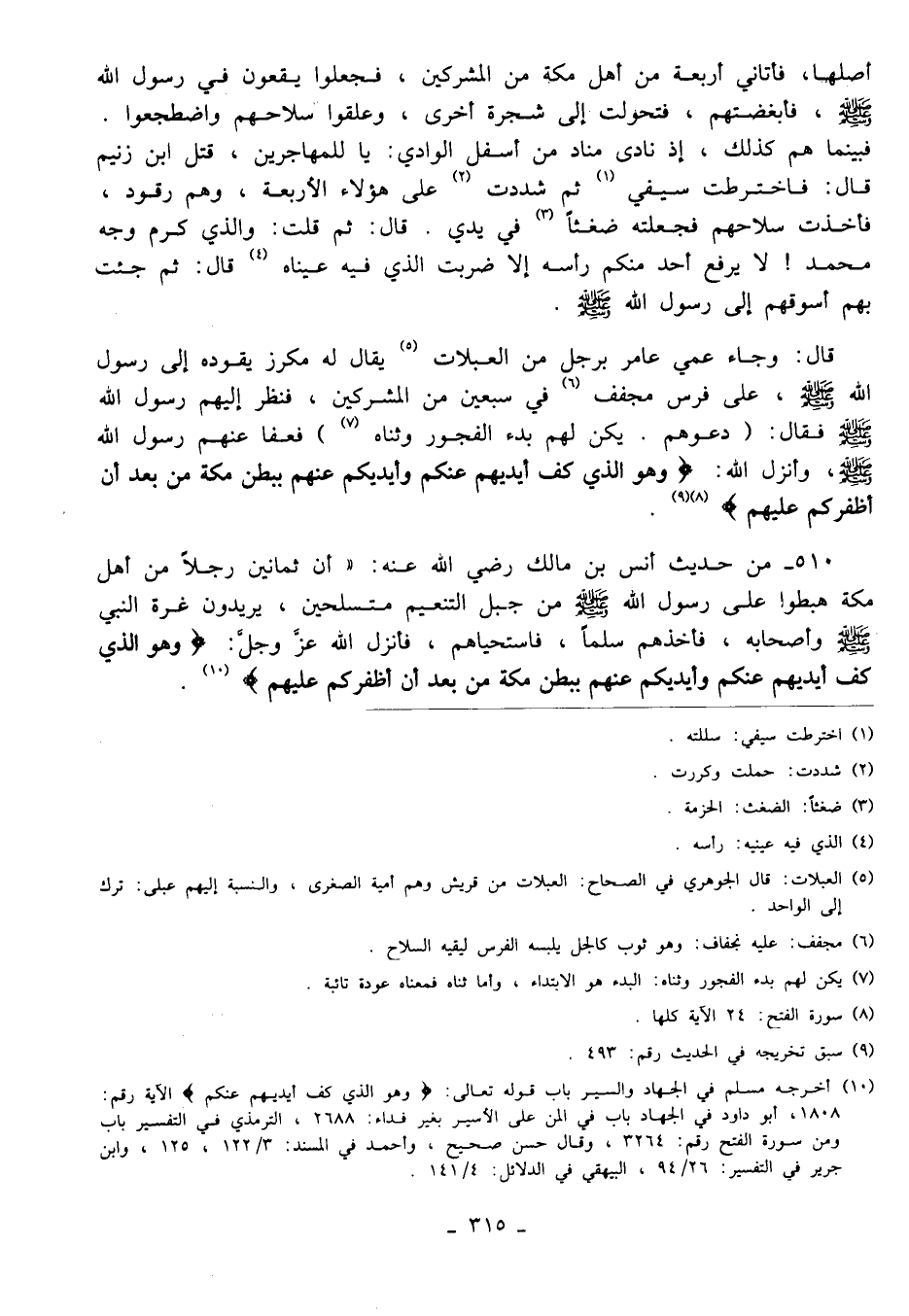 510 - من حديث أنس بن مالك رضي الله عنه: "أن ثمانين رجلًا من أهل مكة هبطوا على رسول الله - صلى الله عليه وسلم - من جبل التنعيم متسلحين، يريدون غرة النبي - صلى الله عليه وسلم - وأصحابه، فأخذهم سلمًا، فاستحياهم، فأنزل الله عَزَّ وَجَلَّ: {وهو الذي كف أيديهم عنكم وأيديكم عنهم ببطن مكة من بعد أن أظفركم عليهم} (¬10).