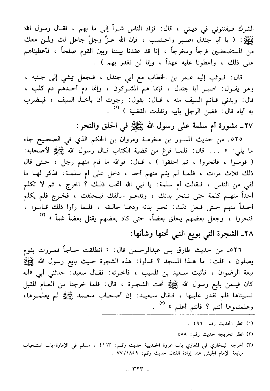 525 - من حديث المسور بن مخرمة ومروان بن الحكم الذي في الصحيح جاء ما يلي: " ... قال: فلما فرغ من قضية الكتاب قال رسول الله - صلى الله عليه وسلم - لأصحابه: (قوموا، فانحروا، ثم احلقوا)، قال: فوالله ما قام منهم رجل، حتى قال ذلك ثلاث مرات، فلما لم يقم منهم أحد، دخل على أم سلمة، فذكر لها ما لقي من الناس، فقالت أم سلمة: يا نبي الله أتحب ذلك؟ اخرج، ثم لا يكلم أحدًا منهم كلمة حتى تنحر بدنك، وتدعو حالقك فيحلقك، فخرج فلم يكلم أحدًا منهم حتى فعل ذلك: نحو بدنه ودعا حالقه، فلما رأوا ذلك قاموا، فنحروا، وجعل بعضهم يحلق بعضًا، حتى كاد بعضهم يقتل بعضًا غمًّا" (¬2).