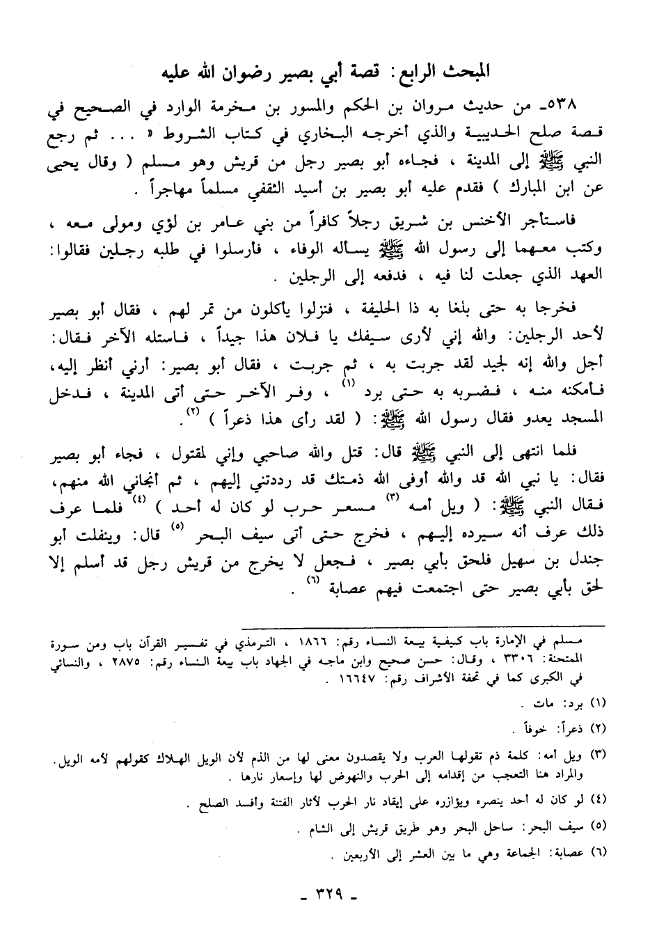 538 - من حديث مروان بن الحكم والمسور بن مخرمة الوارد في الصحيح في قصة صلح الحديبية والذي أخرجه البخاري في كتاب الشروط " ... ثم رجع النبي - صلى الله عليه وسلم - إلى المدينة، فجاءه أبو بصير رجل من قريش وهو مسلم (وقال يحيى عن ابن المبارك) فقدم عليه أبو بصير بن أسيد الثقفي مسلمًا مهاجرًا.