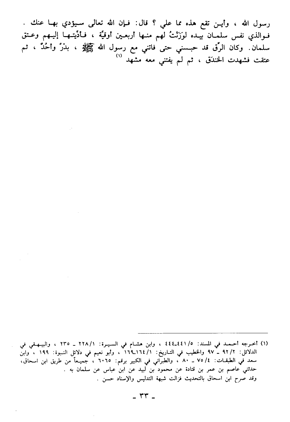 فوالذي نفس سلمان بيده لوَزَنْتُ لهم منها أربعين أوقيَّة، فأدَّيتها إليهم وعتق سلمان. وكان الرِّق قد حبسني حتى فاتني مع رسول الله - صلى الله عليه وسلم -، بدْرٌ وأحُدٌ، ثم عتقت فشهدت الخندَق، ثم لم يفتني معه مشهد (¬1)