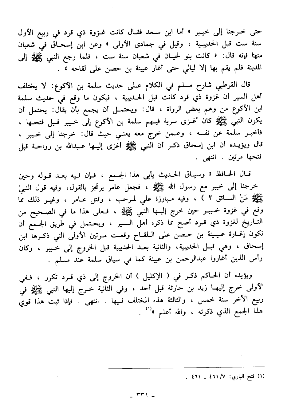 قال الحافظ "وسياق الحديث يأبى هذا الجمع، فإن فيه بعد قوله وحين خرجنا إلى خيبر مع رسول الله - صلى الله عليه وسلم -، فجعل عامر يرتجز بالقول، وفيه قول النبي - صلى الله عليه وسلم - مَنْ السائق؟)، وفيه مبارزة علي لمرحب، وقتل عامر، وغير ذلك مما وقع في غزوة خيبر حين خرج إليها النبي - صلى الله عليه وسلم -، فعلى هذا ما في الصحيح من التاريخ لغزوة ذي قرد أصح مما ذكره أهل السير، ويحتمل في طريق الجمع أن تكون إغارة عيينة بن حصن على اللقاح وقعت مرتين الأولى التي ذكرها ابن إسحاق، وهي قبل الحديبية، والثانية بعد الحديبية قبل الخروج إلى خيبر، وكان رأس الذين أغاروا عبد الرحمن بن عيينة كما في سياق سلمة عند مسلم.