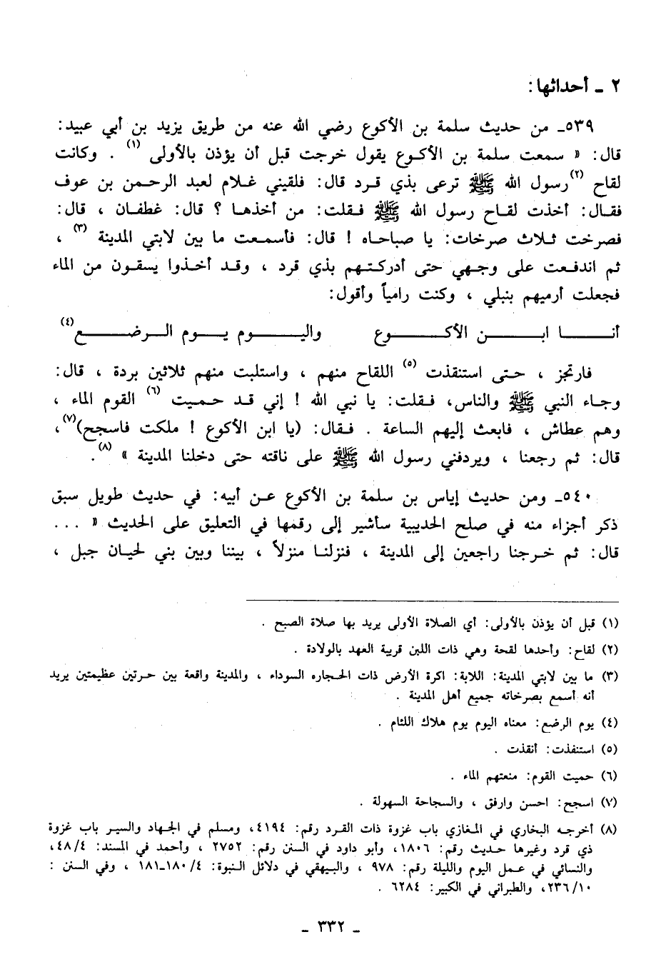 (¬8) أخرجه البخاري في المغازي باب غزوة ذات القرد رقم: 4194، ومسلم في الجهاد والسير باب غزوة ذي قرد وغيرها حديث رقم: 1806، وأبو داود في السنن رقم: 2752، وأحمد في المسند: 4/ 48، والنسائي في عمل اليوم والليلة رقم: 978، والبيهقي في دلائل النبوة: 4/ 180 - 181، وفي السنن: 10/ 236، والطبراني في الكبير: 6284.
