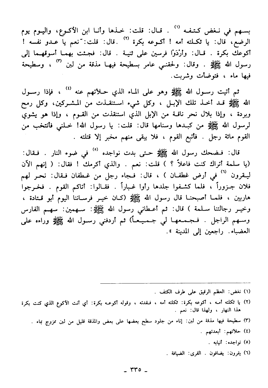ثم أتيت رسول الله - صلى الله عليه وسلم - وهو على الماء الذي حلأتهم عنه (¬4)، فإذا رسول الله - صلى الله عليه وسلم - قد أخذ تلك الإبل، وكل شيء استنقذت من المشركين، وكل رمح وبردة، وإذا بلال نحو ناقة من الإبل الذي استنقذت من القوم، وإذا هو يشوي لرسول الله - صلى الله عليه وسلم - من كبدها وسنامها قال: قلت: يا رسول الله! خلني فأنتخب من القوم مائة رجل. فاتبع القوم، فلا يبقى منهم مخبر إلا قتلته.