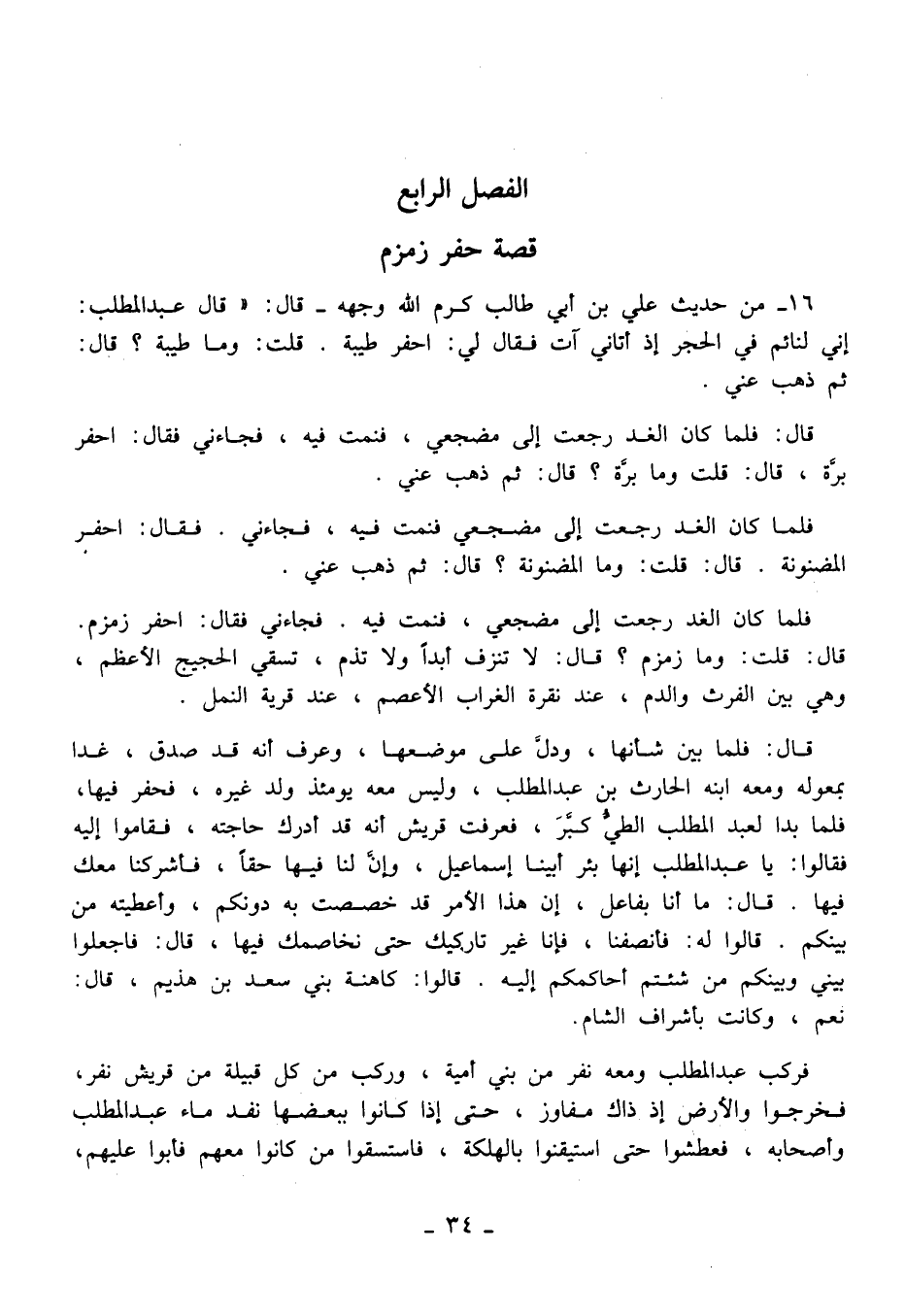 16 - من حديث علي بن أبي طالب كرم الله وجهه- قال: "قال عبد المطلب: إني لنائم في الحجر إذ أتاني آت فقال لي: احفر طيبة. قلت: وما طيبة؟ قال: ثم ذهب عني.