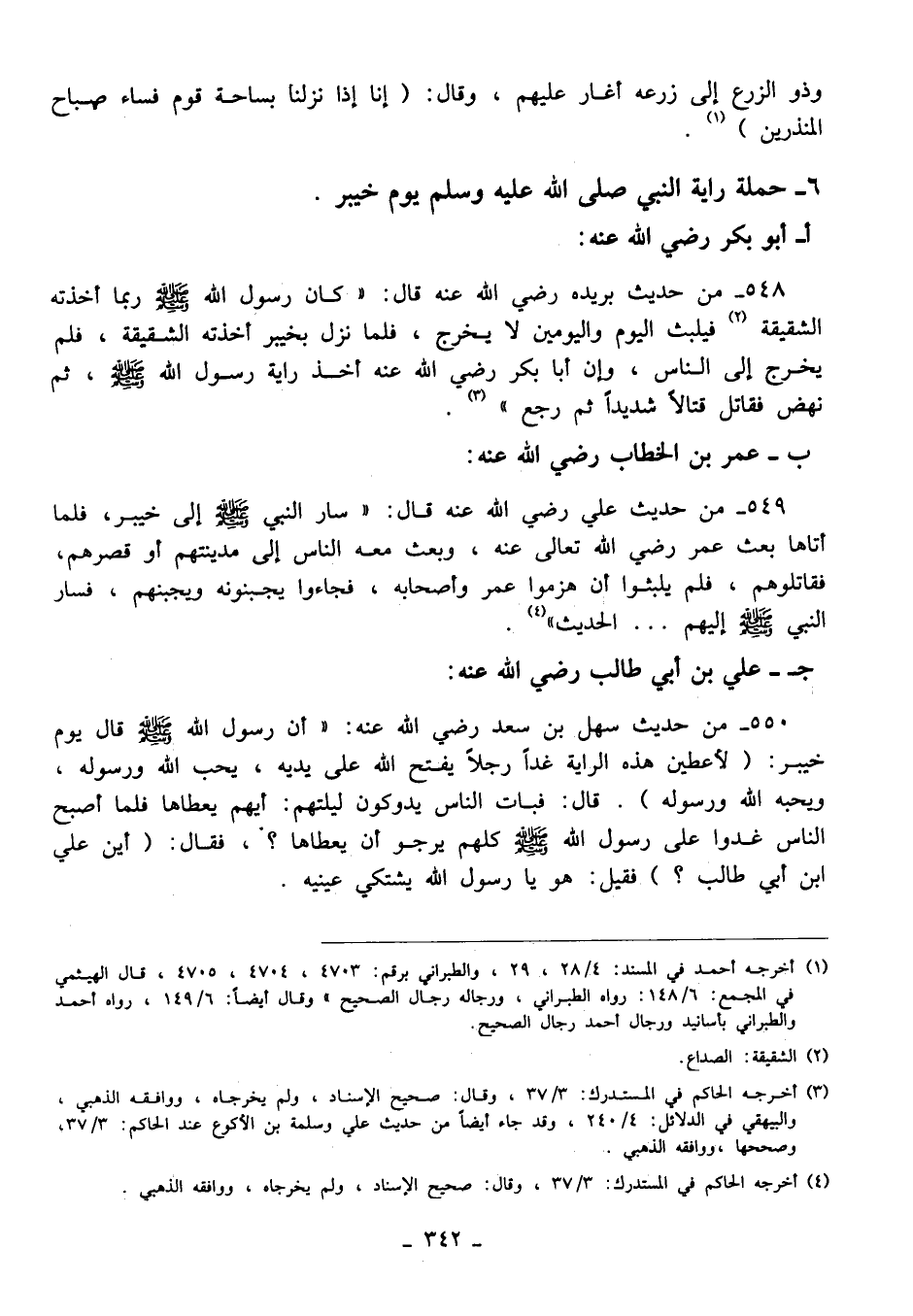 (¬3) أخرجه الحاكم في المستدرك: 3/ 37، وقال: صحيح الإسناد، ولم يخرجاه، ووافقه الذهبي، والبيهقي في الدلائل: 4/ 240، وقد جاء أيضًا من حديث علي وسلمة بن الأكوع محمد الحاكم: 3/ 37، وصححها، ووافقه الذهبي.
