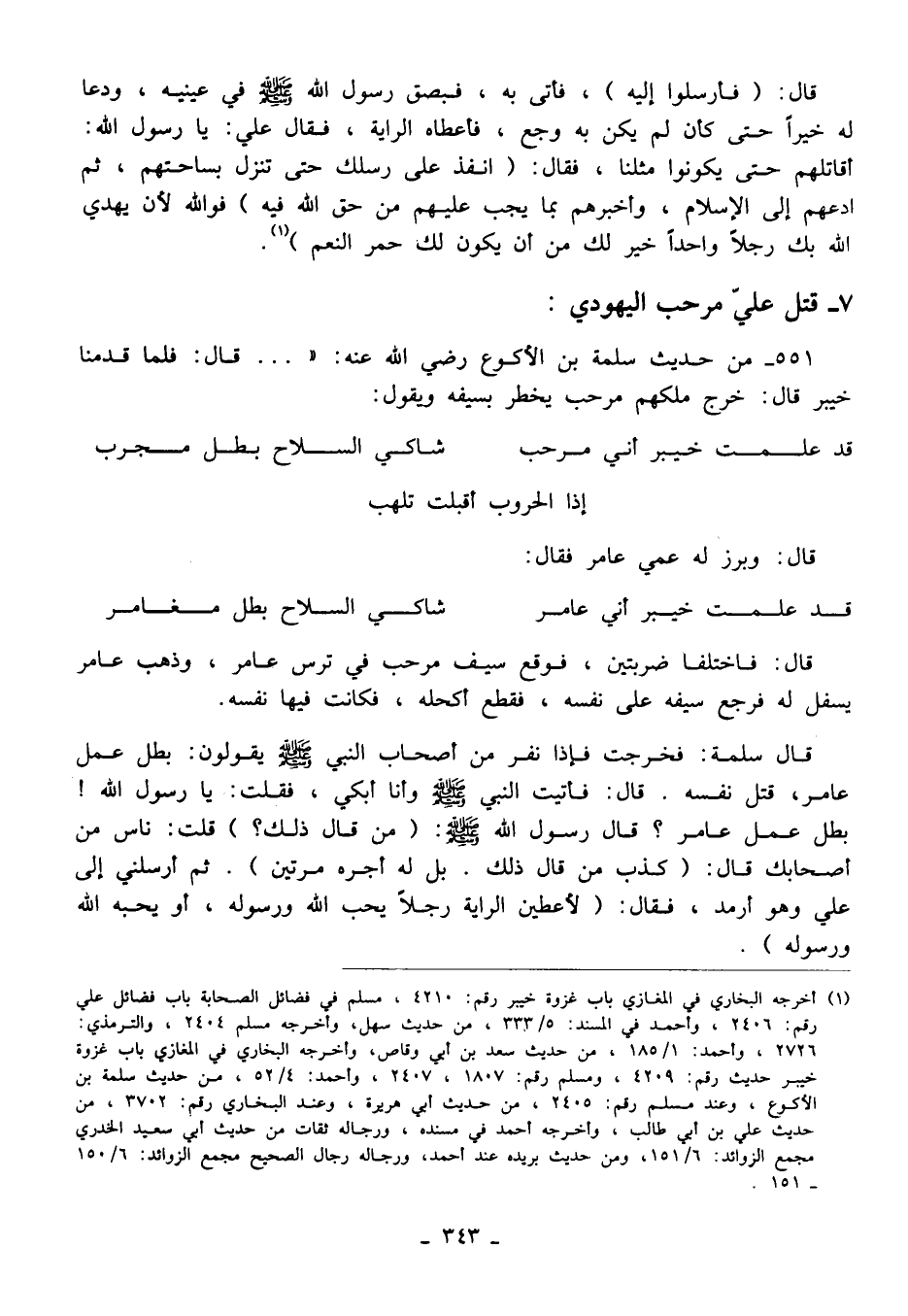 (¬1) أخرجه البخاري في المغازي باب غزوة خيبر رقم: 4210، مسلم في فضائل الصحابة باب فضائل علي رقم: 2406، وأحمد في المسند: 5/ 333، من حديث سهل، وأخرجه سلم 2404، والترمذي: 2726، وأحمد: 1/ 185، من حديث سعد بن أبي وقاص، وأخرجه البخاري في المغازي باب غزوة خيبر حديث رقم: 4209، ومسلم رقم: 1807، 2407، وأحمد: 4/ 52، من حديث سلمة بن الأكوع، ومحمد مسلم رقم: 2405، من حديث أبي هريرة، ومحمد البخاري رقم: 3702، من حديث علي بن أبي طالب، وأخرجه أحمد في مسنده، ورجاله ثقات من حديث أبي سعيد الخدري مجمع الزوائد: 6/ 151، ومن حديث بريدة عند أحمد، ورجاله رجال الصحيح مجمع الزوائد: 6/ 150 - 151.