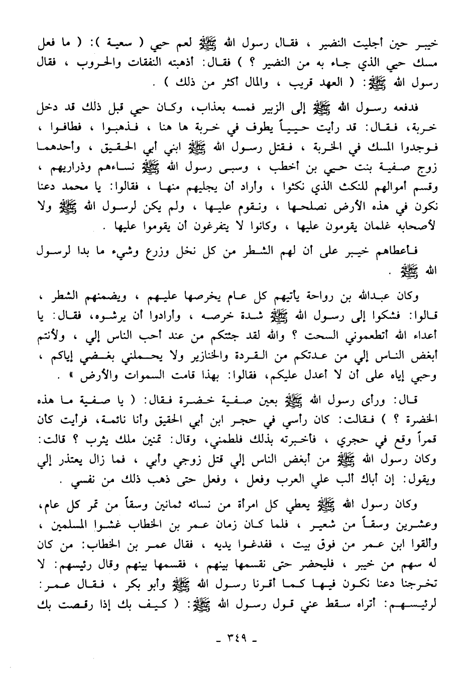 وكان رسول الله - صلى الله عليه وسلم - يعطي كل امرأة من نسائه ثمانين وسقًا من تمر كل عام، وعشرين وسقًا من شعير، فلما كان زمان عمر بن الخطاب غشوا المسلمين، وألقوا ابن عمر من فوق بيت، ففدغوا يديه، فقال عمر بن الخطاب: من كان له سهم من خيبر، فليحضر حتى نقسمها بينهم، فقسمها بينهم وقال رئيسهم: لا تخرجنا دعنا نكون فيها كما أقرنا رسول الله - صلى الله عليه وسلم - وأبو بكر، فقال عمر: لرئيسهم: أتراه سقط عني قول رسول الله - صلى الله عليه وسلم -: (كيف بك إذا رقصت بك