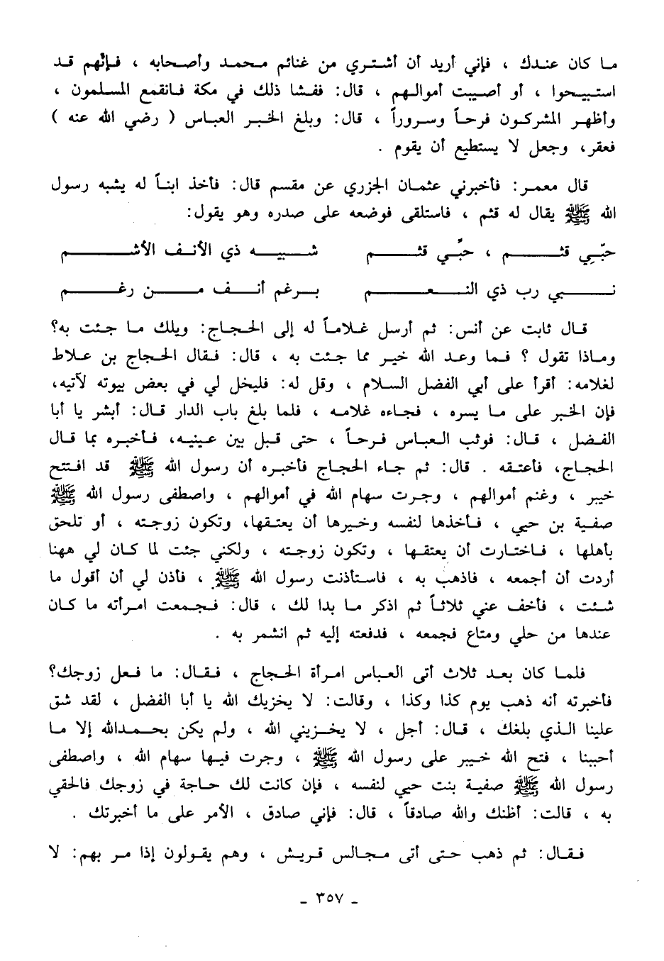 فلما كان بعد ثلاث أتى العباس امرأة الحجاج، فقال: ما فعل زوجك؟ فأخبرته أنه ذهب يوم كذا وكذا، وقالت: لا يخزيك الله يا أبا الفضل، لقد شق علينا الذي بلغك، قال: أجل، لا يخزيني الله، ولم يكن بحمد الله إلا ما أحببنا، فتح الله خيبر على رسول الله - صلى الله عليه وسلم -، وجرت فيها سهام الله، واصطفى رسول الله - صلى الله عليه وسلم - صفية بنت حيي لنفسه، فإن كانت لك حاجة في زوجك فالحقي به، قالت: أظنك والله صادقًا، قال: فإني صادق، الأمر على ما أخبرتك.